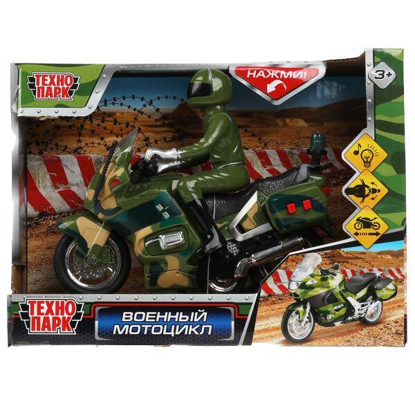 Аннотация: Модель пластик свет-звук МОТОЦИКЛ ВОЕННЫЙ 15 см, 2 кноп, инерц, камуф, кор. Технопарк в кор.2*24шт