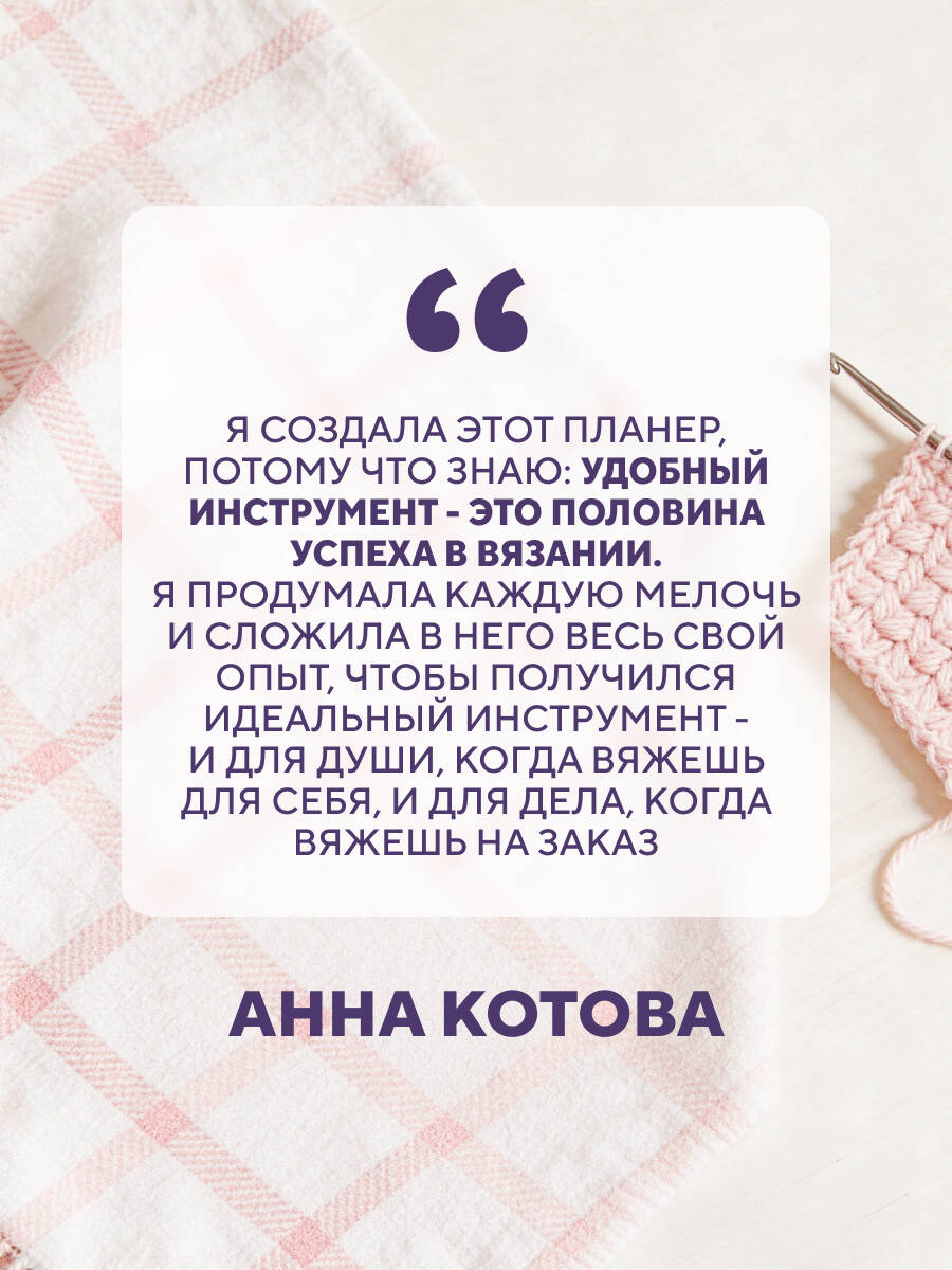 Ваш идеальный спутник в мире вязания! Этот специально созданный планер станет надежным хранителем всех ваших творческих замыслов. Здесь найдется место для всего: от таблиц для шапок и шарфов до учета пряжи и любимых мастер-классов. ТРИ ОФОРМЛЕНИЯ: ВЫБИРАЙ ТОТ, ЧТО НРАВИТСЯ ИМЕННО ТЕБЕ! ВСЁ ДЛЯ ВАШЕГО ХОББИ В ОДНОМ МЕСТЕ: • Система проектов: специализированные развороты для записи всех деталей - от шапок и шарфов до сложных изделий. • Полезные таблицы и справочники. • Организация: трекер, планы на год и месяц, список любимых магазинов пряжи. • Практичные страницы: линейка для замеров образцов, качественная бумага 100 г/м², удобная пружинная конструкция. Компактный формат легко поместится в сумку и станет вашим верным спутником на прогулках, вязальных встречах или в путешествиях. ИДЕАЛЬНЫЙ ПОДАРОК для любой рукодельницы! Порадуйте себя, бабушку, маму, подругу или коллегу - преподнесите продуманный аксессуар для творчества. Такой подарок поможет творить с еще большим вдохновением, легко организовывать свои проекты и хранить самые важные идеи в одном месте. Создавайте, вдохновляйтесь и будьте организованны с вашим новым вязальным планером!| Издательство | ООО "Издательство "Эксмо" |