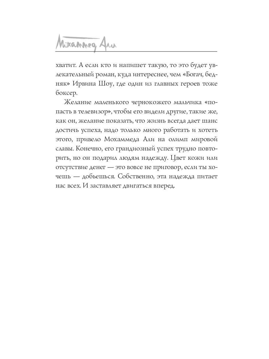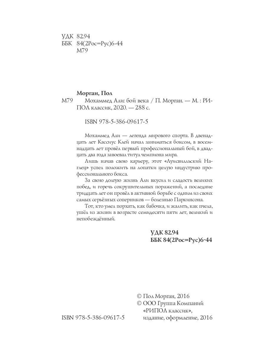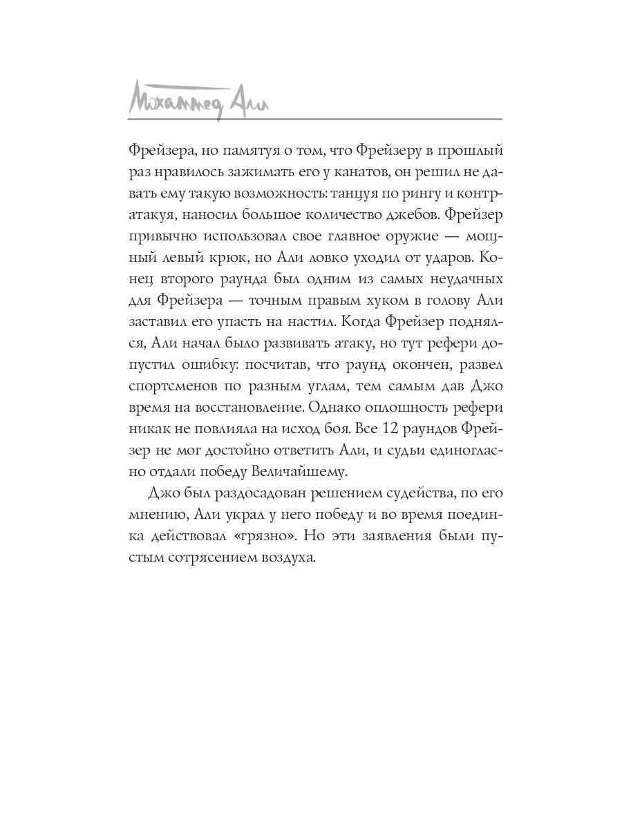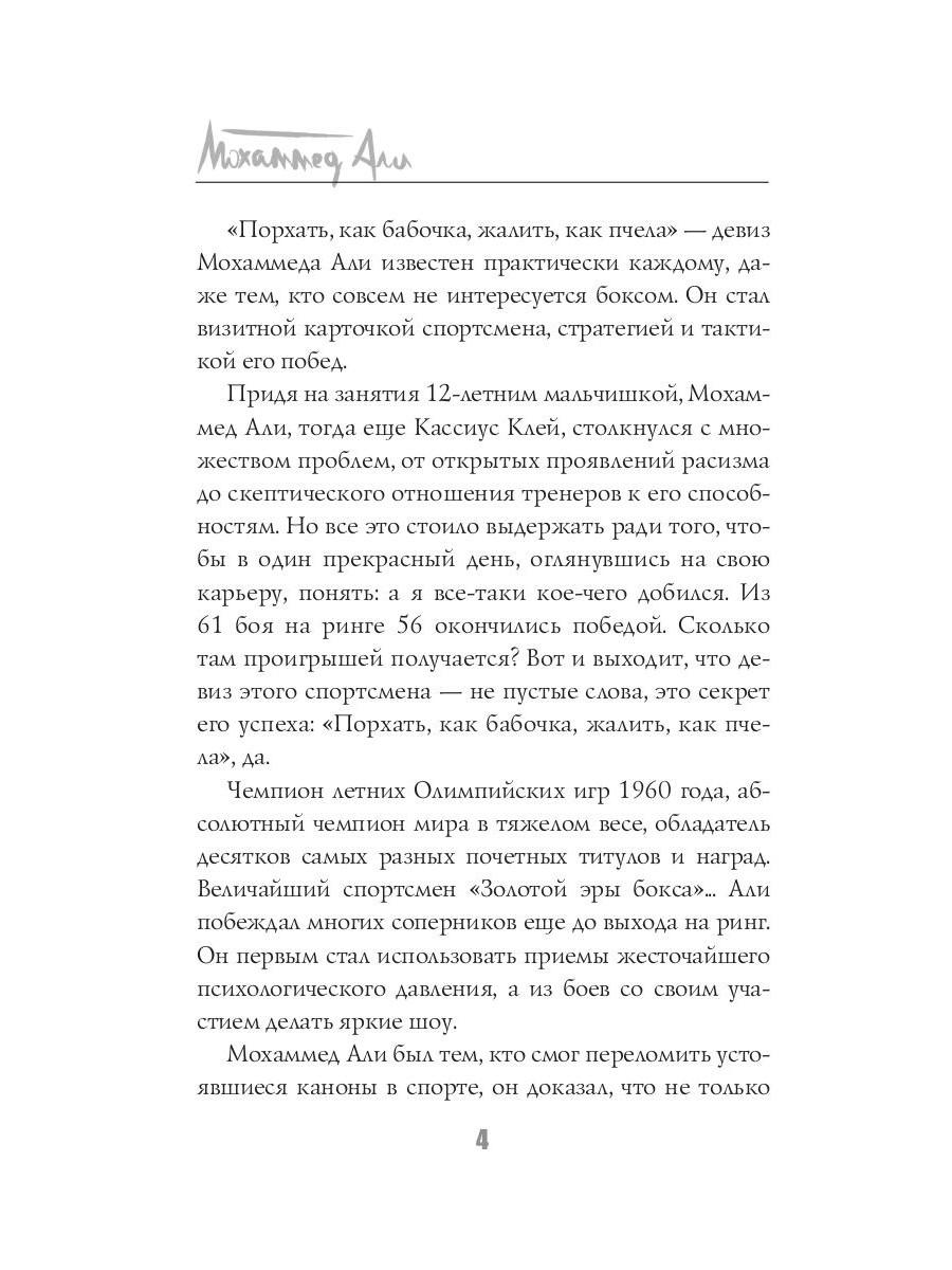 Мохаммед Али - легенда мирового спорта. В двенадцать лет Кассиус Клей начал заниматься боксом, в восемнадцать лет провёл первый профессиональный бой, в двадцать два года завоевал титул чемпиона мира. Лишь начав свою карьеру, этот «Луисвилльский Наглец» успел положить на лопатки целую индустрию профессионального бокса. За свою долгую жизнь Али вкусил и сладость великих побед, и горечь сокрушительных поражений, а последние тридцать лет он провёл в активной борьбе с одним из своих самых серьёзных соперников - болезнью Паркинсона. Тот, кто умел порхать, как бабочка, и жалить, как пчела, ушёл из жизни в возрасте семидесяти пяти лет, великий и непобеждённый.| Издательство | Рипол Классик |