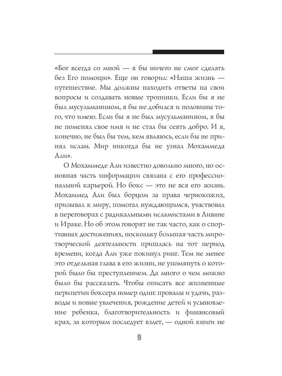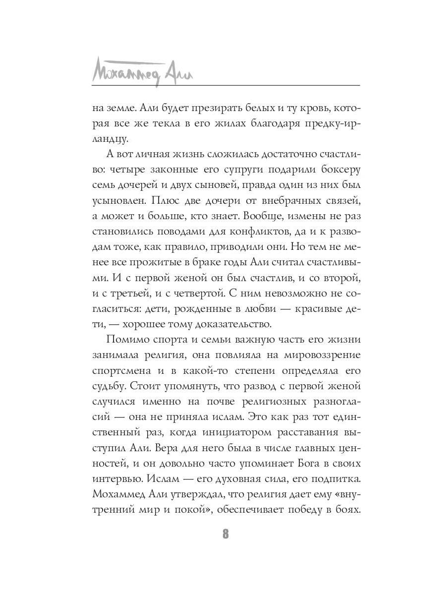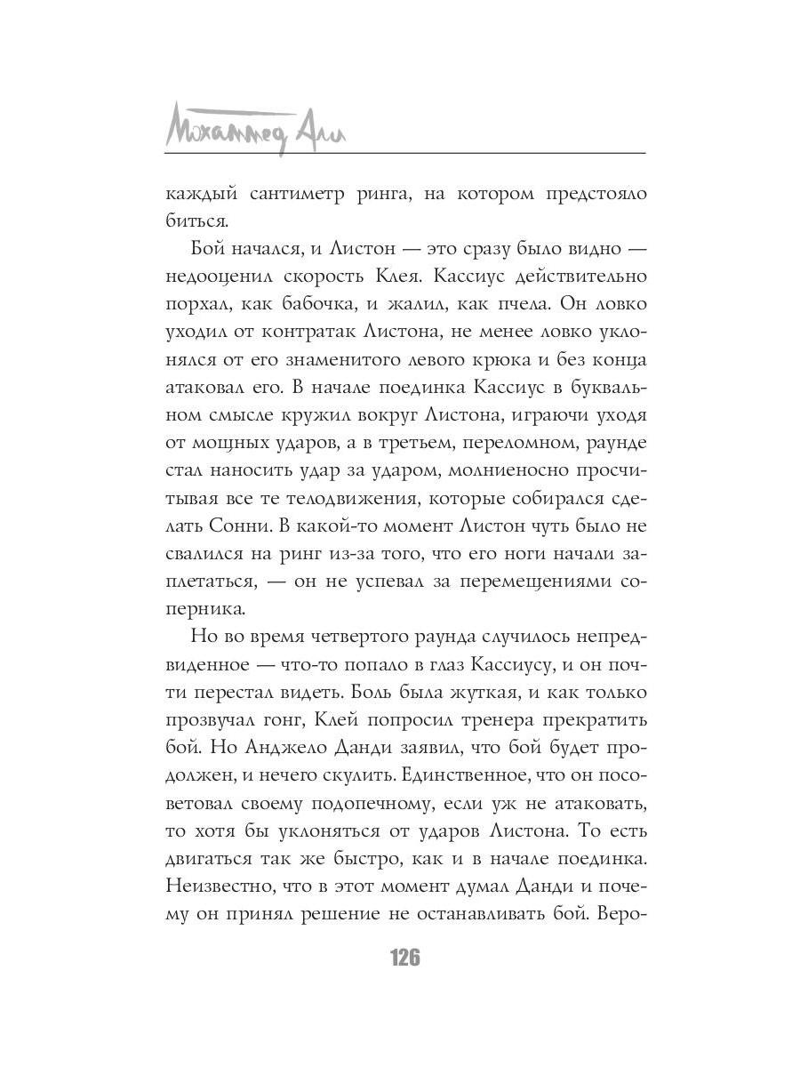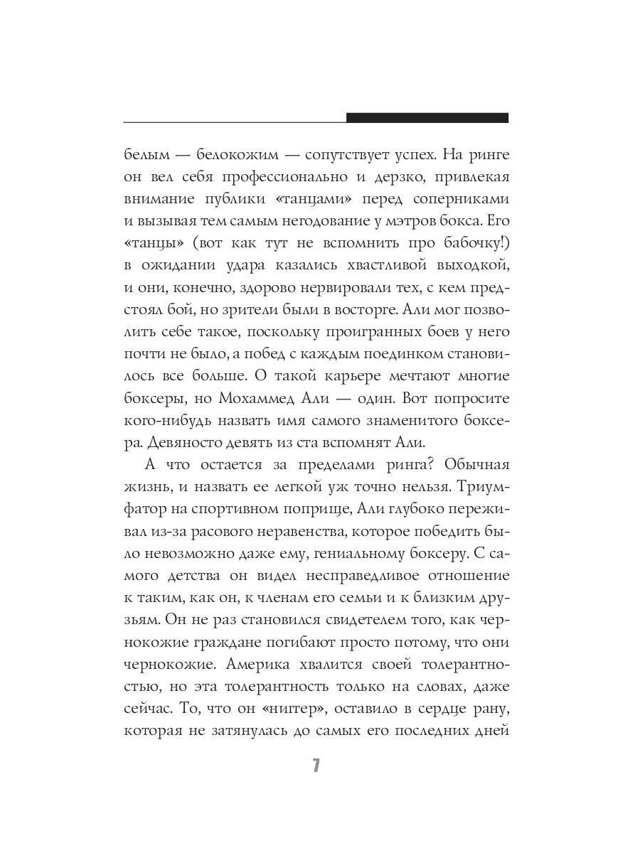Мохаммед Али - легенда мирового спорта. В двенадцать лет Кассиус Клей начал заниматься боксом, в восемнадцать лет провёл первый профессиональный бой, в двадцать два года завоевал титул чемпиона мира. Лишь начав свою карьеру, этот «Луисвилльский Наглец» успел положить на лопатки целую индустрию профессионального бокса. За свою долгую жизнь Али вкусил и сладость великих побед, и горечь сокрушительных поражений, а последние тридцать лет он провёл в активной борьбе с одним из своих самых серьёзных соперников - болезнью Паркинсона. Тот, кто умел порхать, как бабочка, и жалить, как пчела, ушёл из жизни в возрасте семидесяти пяти лет, великий и непобеждённый.| Издательство | Рипол Классик |