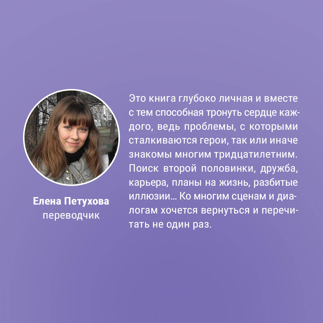 "Это книга глубоко личная и вместе с тем способная тронуть сердце каждого, ведь проблемы, с которыми сталкиваются герои, так или иначе знакомы многим тридцатилетним. Поиск второй половинки, дружба, карьера, планы на жизнь, разбитые иллюзии… Автор обращается к такой тонкой материи, как человеческие отношения, но делает это без надрыва, а с легкой иронией. В результате ко многим сценам и диалогам хочется вернуться и перечитать не один раз".- Елена Петухова, переводчик