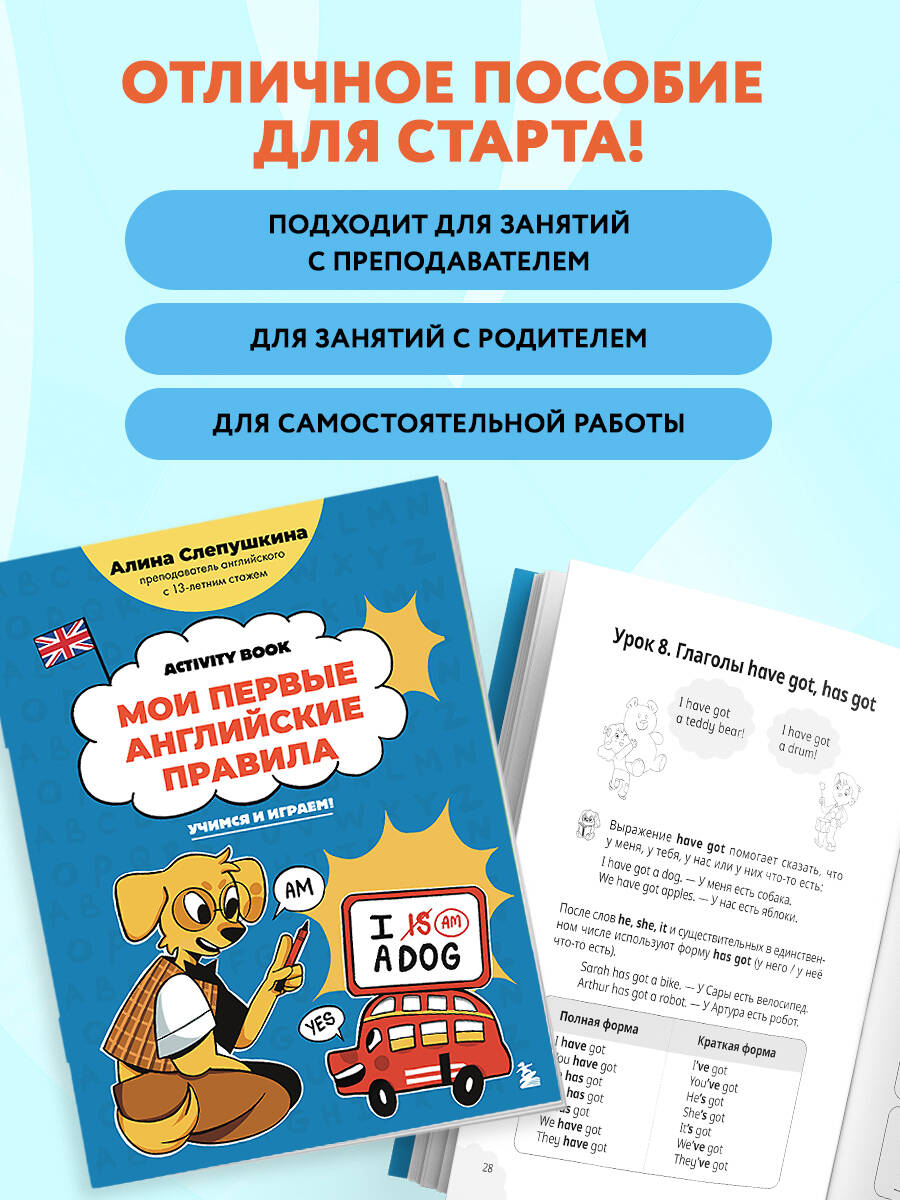 «Мои первые правила английского» - это увлекательное пособие, которое поможет ребенку легко и с интересом освоить основы английской грамматики. Ребята будут учиться правильно строить простые предложения, выполнять задания на чтение и письмо, а также закреплять знания через веселые игры и упражнения. Игровой формат превращает обучение в интересное путешествие, развивая внимание, воображение и мелкую моторику. Книга подойдет детям младшего школьного возраста и станет отличным помощником как для самостоятельных занятий дома, так и в качестве дополнения к школьной программе. С этой книгой ребенок сделает первые уверенные шаги в понимании грамматики и почувствует себя настоящим знатоком английского языка. Activity Book - серия увлекательных и понятных пособий по английскому языку для детей. В каждой книге ребенок учится через игру: пишет, рисует, раскрашивает, запоминает новые слова и постепенно делает уверенные шаги в изучении английского. Плюсы серии: - простые и доступные задания; - современный подход к обучению от опытного преподавателя Алины Слепушкиной; - красочные иллюстрации; - практическая польза для школьной программы и домашних занятий.| Издательство | ООО "Издательство "Эксмо" |