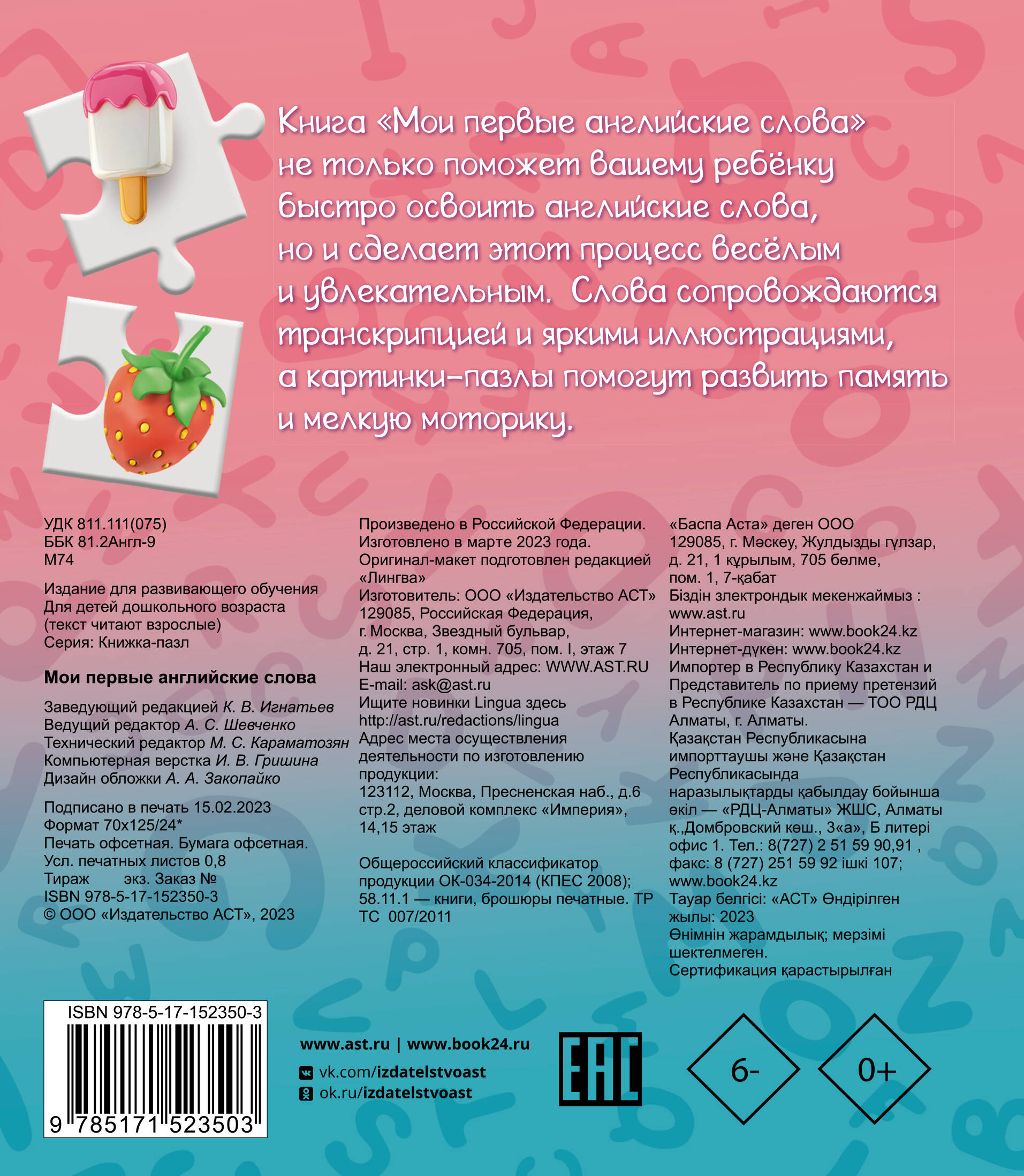 Книга "Мои первые английские слова" не только поможет вашему ребенку быстро освоить английские слова, но и сделает этот процесс веселым и увлекательным. Слова сопровождаются транскрипцией и яркими иллюстрациями, а картинки-пазлы помогут развить память и мелкую моторику.