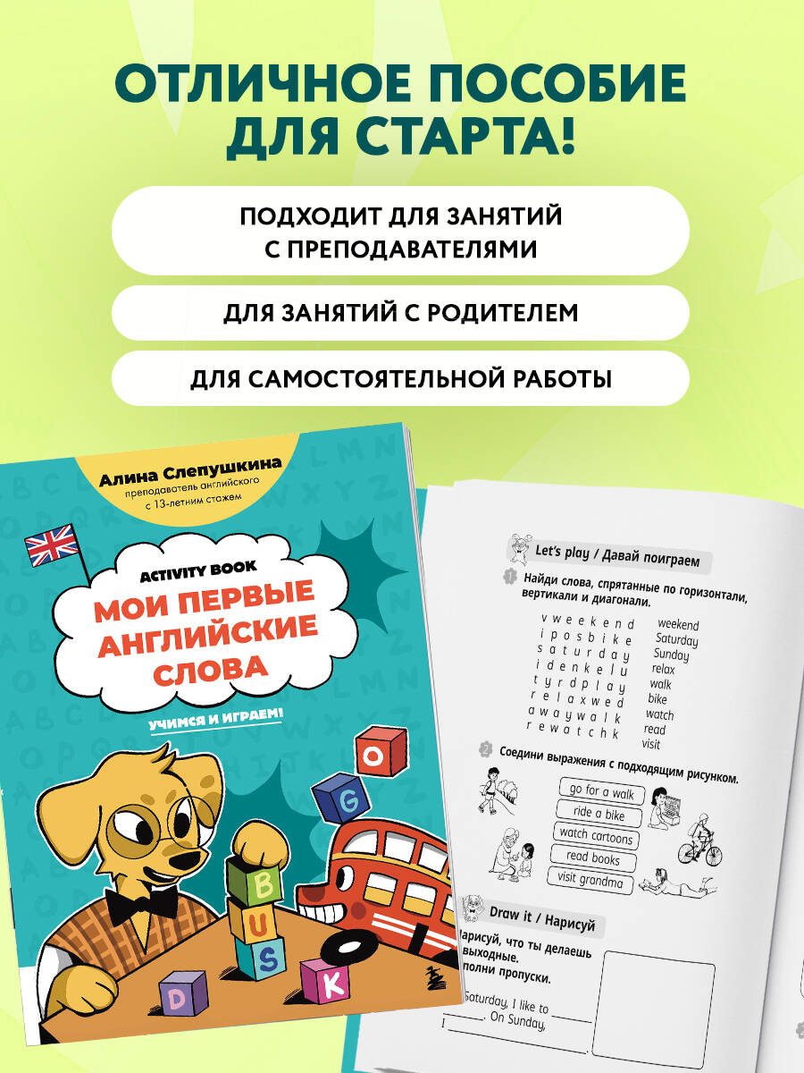 «Мои первые английские слова» - это увлекательное пособие, которое поможет ребенку легко и с интересом пополнить свой словарный запас. Ребята будут учить новые английские слова, читать и писать их, а также выполнять задания, развивающие внимание, воображение и мелкую моторику. Веселые игры и занимательные упражнения превращают обучение в захватывающее приключение, где каждое задание помогает закрепить материал и сделать шаг вперед в изучении языка. Книга отлично подойдет детям младшего школьного возраста и станет надежным помощником как для самостоятельных занятий дома, так и в качестве дополнения к школьной программе. С этой книгой ребенок не только выучит свои первые английские слова, но и научится уверенно использовать их в речи. Activity Book - серия увлекательных и понятных пособий по английскому языку для детей. В каждой книге ребенок учится через игру: пишет, рисует, раскрашивает, запоминает новые слова и постепенно делает уверенные шаги в изучении английского. Плюсы серии: - простые и доступные задания; - современный подход к обучению от опытного преподавателя Алины Слепушкиной; - красочные иллюстрации; - практическая польза для школьной программы и домашних занятий.| Издательство | ООО "Издательство "Эксмо" |