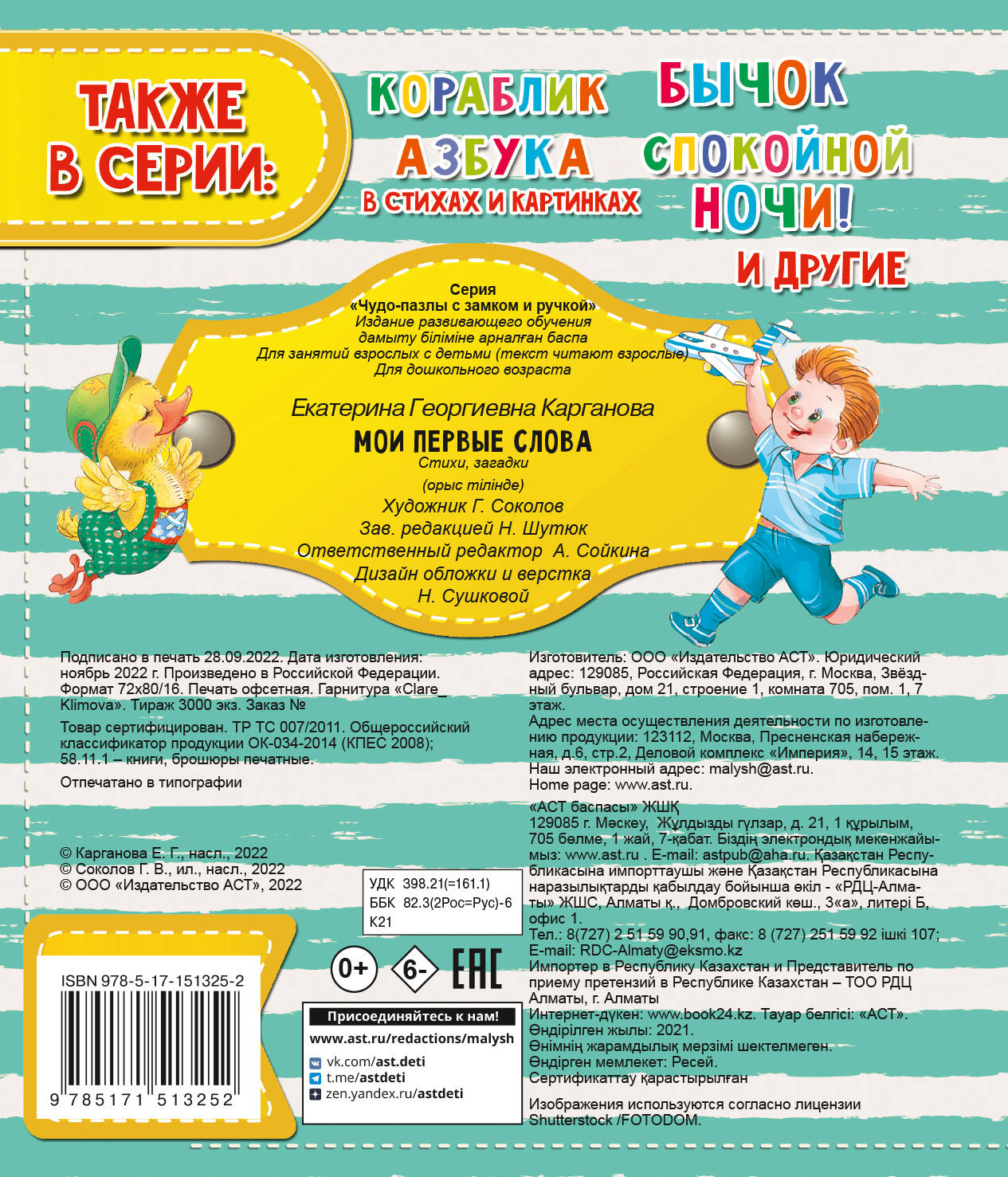 Стихотворения классика детской литературы Екатерины Каргановой, любимые малышами, - теперь в новом формате! На каждом из шести разворотов малыша ждёт красочный пазл из 6 прочных деталей. Рассматривая картинки, собирая пазлы и слушая стихи, кроха будет увеличивать словарный запас, развивать мелкую моторику, концентрацию внимания и усидчивость. Удобная ручка и пластиковый замочек, прикрепленные к книге, позволят взять её с собой в дорогу, на прогулку или в гости. Книги серии "Чудо-пазлы с замком и ручкой" - классика для самых маленьких в удобном игровом формате!| Издательство | ИЗДАТЕЛЬСТВО "АСТ" |