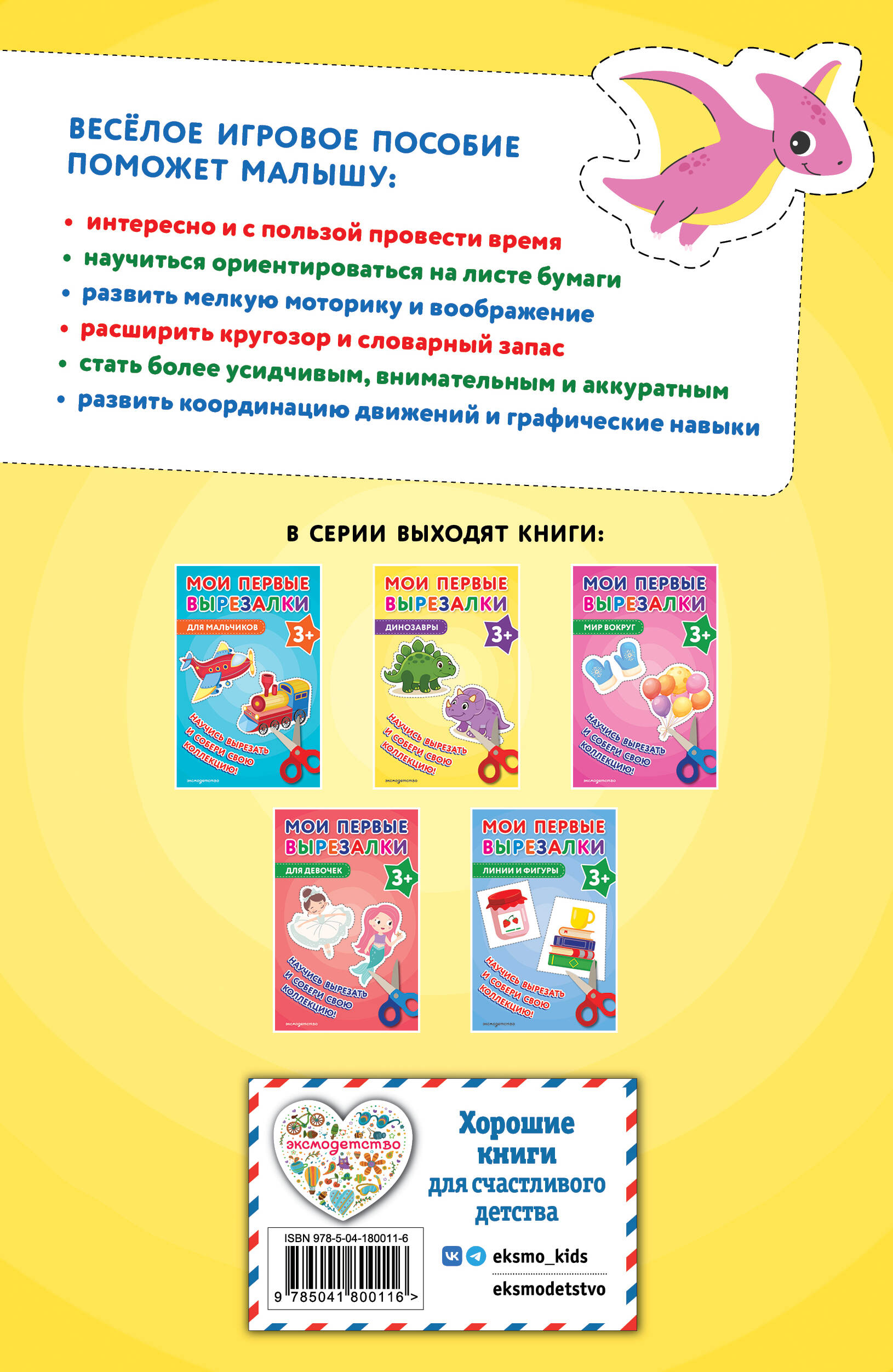 Увлекательная красочная книга-вырезалка для малышей поможет расширить кругозор ребенка, развить мелкую моторику, внимание, воображение, речь, увеличить словарный запас. Заниматься нужно понемногу, постепенно приучая малыша правильно держать ножницы и ориентироваться на листе. Удобный формат, плотная бумага, пунктирные линии сделают работу с книгой максимально удобной для ребенка. Кроме того, книга станет отличным подарком дочери или сыну в день рождения, ее можно взять с собой на дачу, на море, в гости, использовать на занятиях в детском саду или просто поиграть с малышом дома и собрать вместе с ним первую коллекцию динозавров.| Издательство | ООО "Издательство "Эксмо" |
