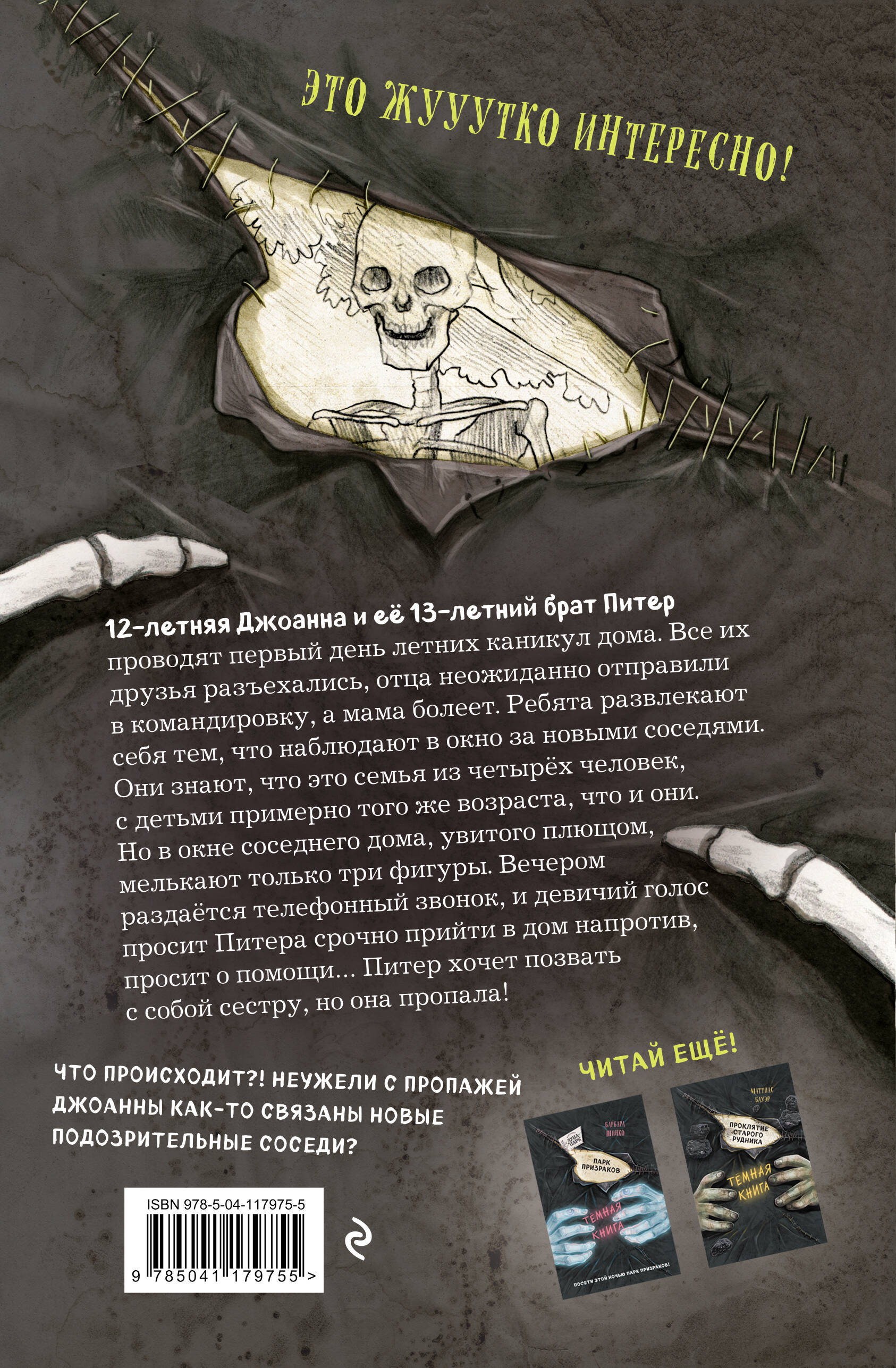 Захватывающие истории и мурашки по коже - то, что надо подросткам! Выпуклые «костяные пальцы» на обложке можно потрогать. Много иллюстраций внутри, читать комфортно. УЗНАЙ МРАЧНУЮ ТАЙНУ ДОМА НАПРОТИВ! 12-летняя Джоанна и её 13-летний брат Питер проводят первый день летних каникул дома. Все их друзья разъехались, отца неожиданно отправили в командировку, а мама болеет. Ребята развлекают себя тем, что наблюдают в окно за новыми соседями. Они знают, что это семья из четырёх человек, с детьми примерно того же возраста, что и они. Но в окне соседнего дома, увитого плющом, мелькают только три фигуры. Вечером раздаётся телефонный звонок, и девичий голос просит Питера срочно прийти в дом напротив, просит о помощи… Питер хочет позвать с собой сестру, но она пропала!| Издательство | ООО "Издательство "Эксмо" |