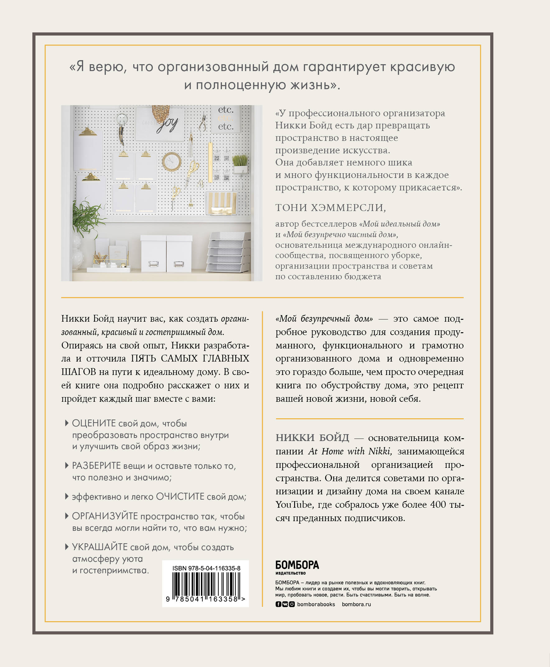 «Я верю, что организованный дом гарантирует красивую и полноценную жизнь». - Никки Бойд «Мой безупречный дом» - это гораздо больше, чем просто очередная книга по домашней организации, это рецепт вашей новой жизни, новой себя. Профессиональный организатор Никки Бойд расскажет про 5 основных шагов на пути к идеальному дому и пройдет их вместе с вами. 1. Оцените свой дом, чтобы преобразовать пространство внутри и улучшить свой образ жизни. 2. Разберите вещи и оставьте только то, что полезно и значимо. 3. Эффективно и легко очистите свой дом. 4. Организуйте пространство так, чтобы вы всегда могли найти то, что вам нужно. 5. Украшайте свой дом, чтобы создать уют и атмосферу гостеприимства. «У профессионального организатора Никки Бойд есть дар превращать пространство в настоящее произведение искусства. Она добавляет немного шика и много функциональности в каждое пространство, к которому прикасается». - Тони Хэммерсли, автор книг «Мой идеальный дом», «Мой безупречно чистый дом»