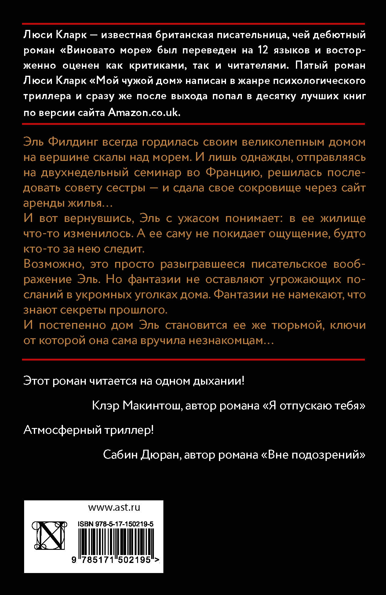 Эль Филдинг всегда гордилась своим великолепным домом на вершине скалы над морем. И лишь однажды, отправляясь на двухнедельный семинар во Францию, решилась последовать совету сестры - и сдала свое сокровище через сайт аренды жилья... И вот вернувшись, Эль с ужасом понимает: в ее жилище что-то изменилось. А ее саму не покидает ощущение, будто кто-то за нею следит. Возможно, это просто разыгравшееся писательское воображение Эль. Но фантазии не оставляют угрожающих посланий в укромных уголках дома. Фантазии не намекают, что знают секреты прошлого. И постепенно дом Эль становится ее же тюрьмой, ключи от которой она сама вручила незнакомцам…