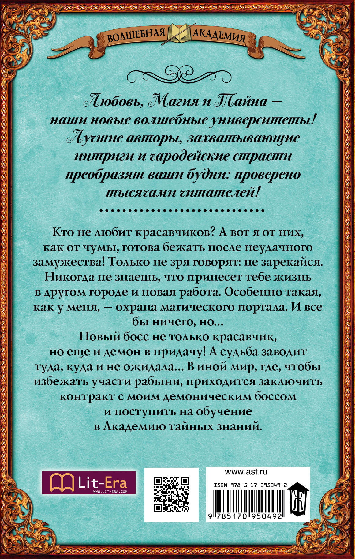 Кто не любит красавчиков? А вот я от них, как от чумы, готова бежать после неудачного замужества! Только не зря говорят: не зарекайся. Никогда не знаешь, что принесет тебе жизнь в другом городе и новая работа. Особенно такая, как у меня, - охрана магического портала. И все бы ничего, но… Новый босс не только красавчик, но еще и демон в придачу! А судьба заводит туда, куда и не ожидала… В иной мир, где, чтобы избежать участи рабыни, приходится заключить контракт с моим демоническим боссом и поступить на обучение в Академию тайных знаний.| Издательство | ИЗДАТЕЛЬСТВО "АСТ" |