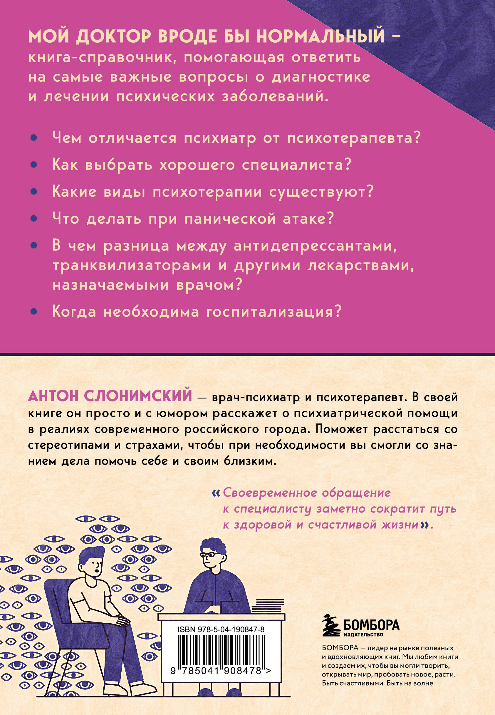 Депрессия, панические атаки, тревожное расстройство, бессонница и даже шизофрения. Существует огромный список заболеваний и их проявлений, с которыми люди обращаются к специалистам в надежде найти лечение и улучшить свое физическое и ментальное состояние. Но несмотря на распространенность проблем с психическим здоровьем, стереотипы о диагностике и лечении существуют до сих пор. Именно поэтому Антон Слонимский, психиатр и психотерапевт, собирает всю самую важную информацию воедино и представляет ее в своей книге. Максимально коротко и полезно. Он дает ценные советы по выбору врача, а также рассказывает, как самостоятельно справиться с тревогой, улучшить сон и наладить свой образ жизни. Вы узнаете, как работает психиатрия в России, и перестанете бояться похода к врачу. «Мой доктор вроде бы нормальный» - аптечка первой помощи при проблемах с психическим здоровьем, которая обязательно должна быть у каждого под рукой.