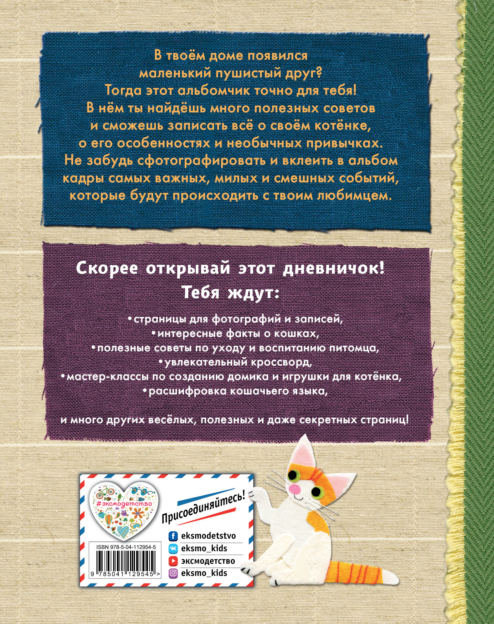 В твоём доме появился маленький пушистый друг? Тогда этот альбомчик точно для тебя! В нём ты найдешь много полезных советов и сможешь записать всё о своём котёнке, о его особенностях и необычных привычках. Не забудь сфотографировать и вклеить в альбом кадры самых важных, милых и смешных событий, которые будут происходить с твоим любимцем.| Издательство | ООО "Издательство "Эксмо" |