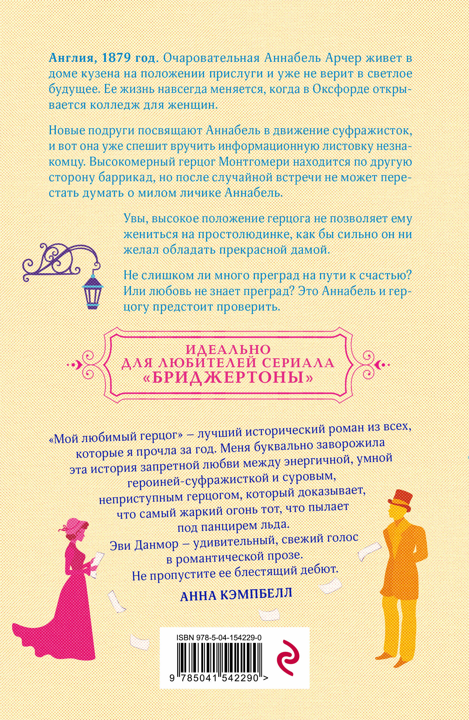 Идеально для фанатов «Бриджертонов» и «Книжных хроник Анимант Крамб». Роман года по версии Publishers Weekly. Лучшая книга месяца на Amazon. Более 50 000 оценок на Goodreads. 20 стран купили права на издание цикла. Эви Данмор создала свой дебютный роман «Мой любимый герцог», вдохновленная волшебными пейзажами Оксфорда и страстью к романтике, интересом к судьбам женщинам с передовыми взглядами и викторианской эпохе. В обычной жизни она консультант в сфере дипломатии, имеет степень магистра, которую получила в Оксфорде. Эви Данмор является членом Британской ассоциации романтических прозаиков (RNA). Писательница живет в Берлине и свое увлечение Англией XIX века отражает в своих произведениях. Англия, 1879 год. Очаровательная Аннабель Арчер живет в доме кузена на положении прислуги и уже не верит в светлое будущее. Ее жизнь навсегда меняется, когда в Оксфорде открывается колледж для женщин. Новые подруги посвящают Аннабель в движение суфражисток, и вот она уже спешит вручить информационную листовку незнакомцу. Высокомерный герцог Монтгомери находится по другую сторону баррикад, но после случайной встречи не может перестать думать о милом личике Аннабель. Увы, высокое положение герцога не позволяет ему жениться на простолюдинке, как бы сильно он ни желал обладать прекрасной дамой. Не слишком ли много преград на пути к счастью? Или любовь не знает преград? Это Аннабель и герцогу предстоит проверить. «"Мой любимый герцог" - лучший исторический роман из всех, которые я прочла за год. Меня буквально заворожила эта история запретной любви между энергичной, умной героиней-суфражисткой и суровым, неприступным герцогом, который доказывает, что самый жаркий огонь тот, что пылает под панцирем льда. Эви Данмор - удивительный, свежий голос в романтической прозе. Не пропустите ее блестящий дебют. - Анна Кэмпбелл «Я увидела будущее исторического романа, и это Эви Данмор». - Ева Ли «Роман Эви Данмор воплотил в себе лучшее из двух жанров - волнующий романтический сюжет и основательность исторического произведения. История женского избирательного движения в Великобритании не менее захватывающая, чем зарождение чувств между Аннабель и Себастьяном». - Рене Розен| Издательство | Эксмо |