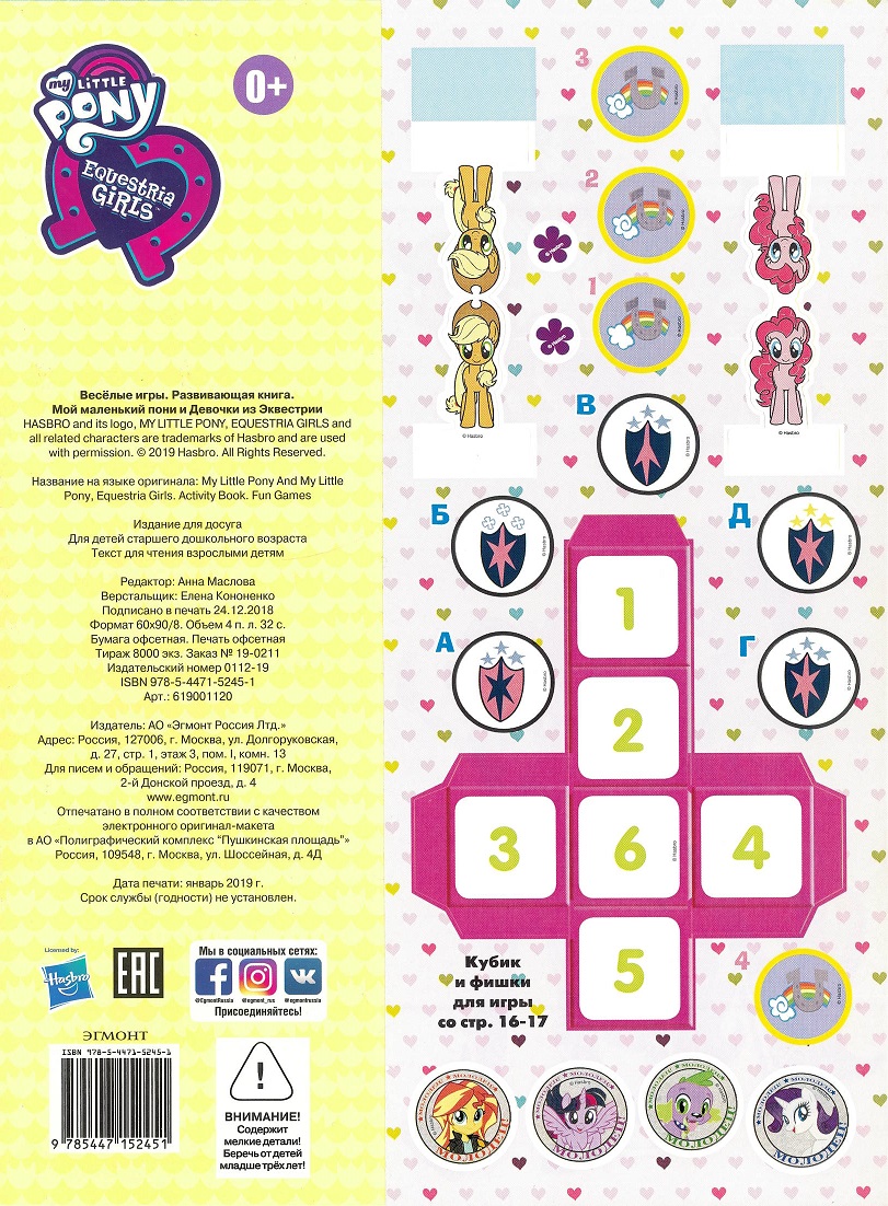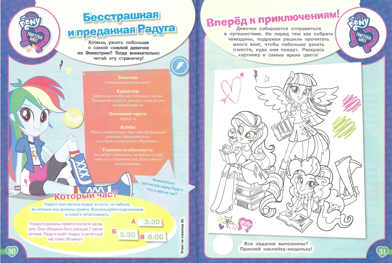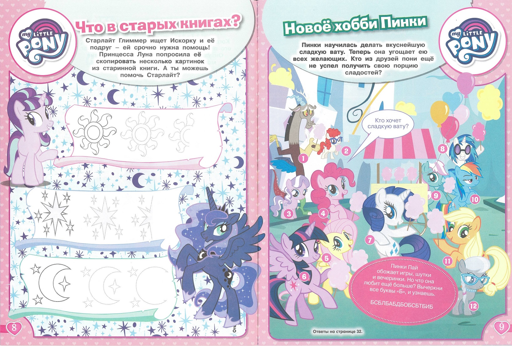 В этой книге тебя ждёт встреча с любимыми героями сериалов «Мой маленький пони» и «Девочки из Эквестрии». Выполняя задания на развитие фантазии, внимательности и творческих способностей, ты переживёшь увлекательные приключения и весело проведёшь время! А игра в середине книги - хороший повод пригласить в гости подругу!