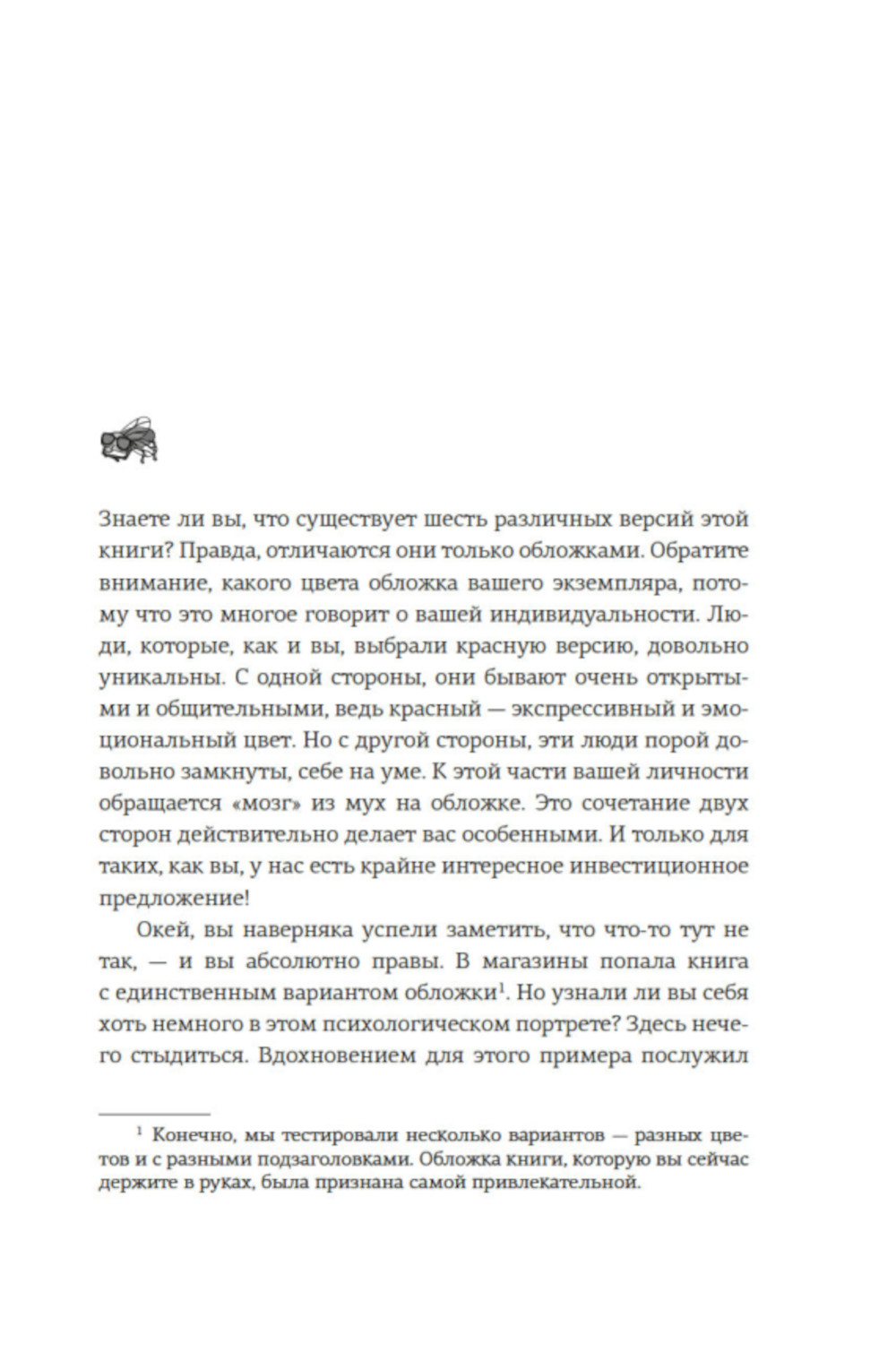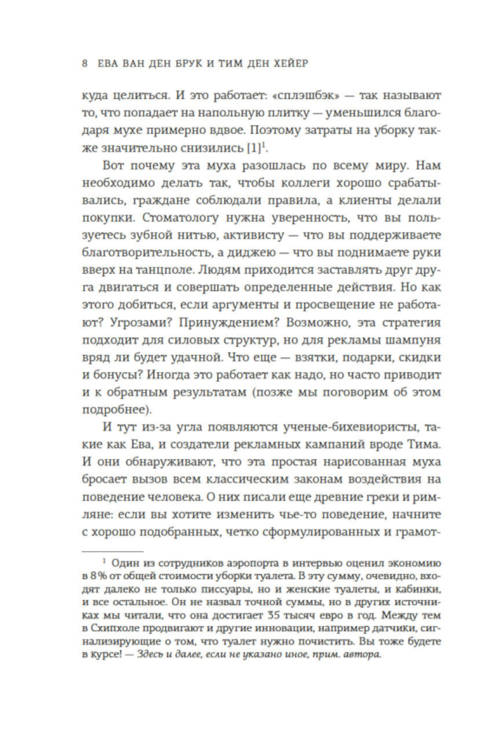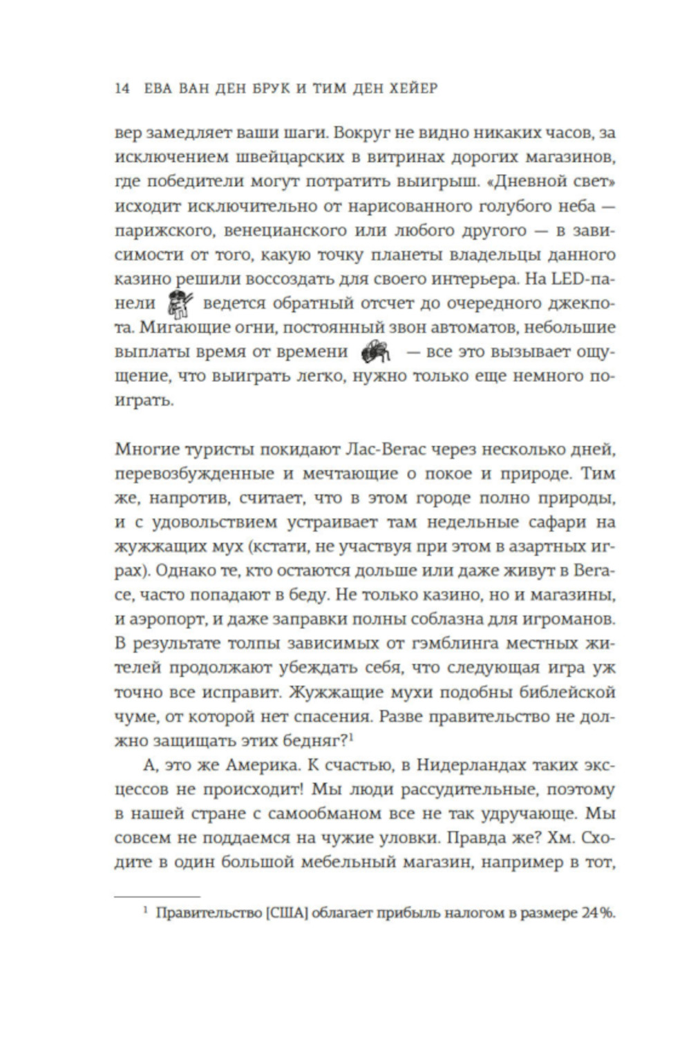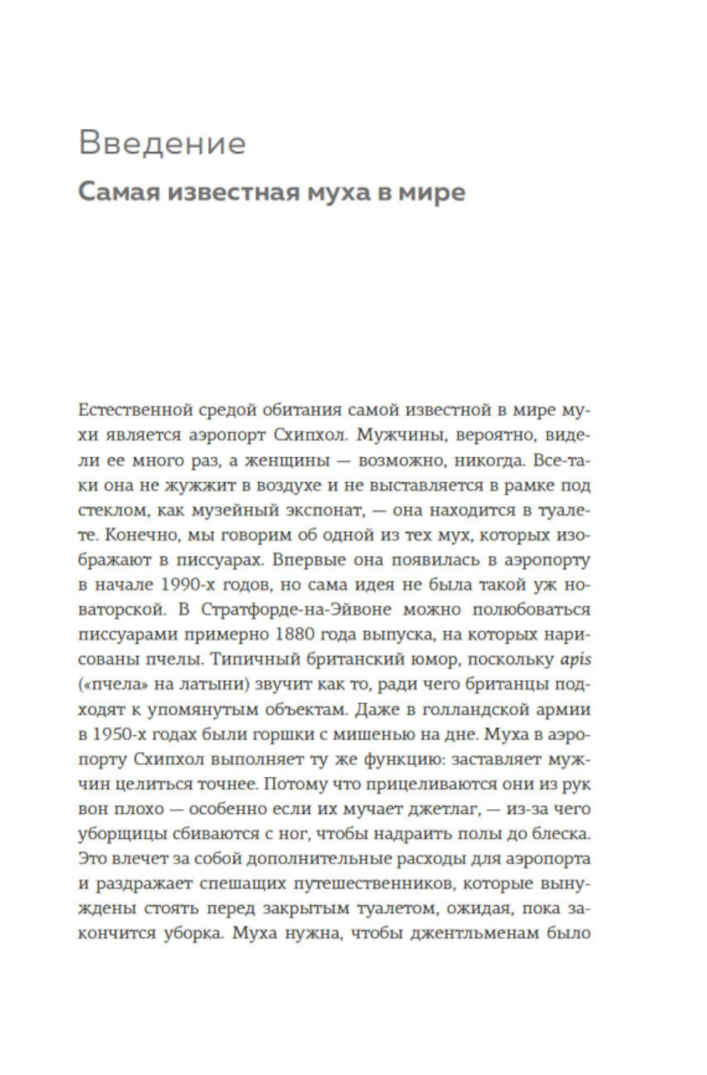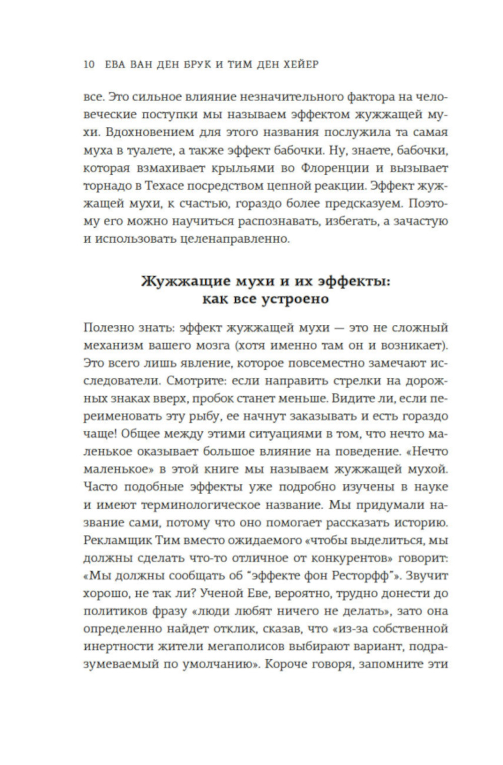 Может ли нарисованная на унитазе муха сэкономить вам деньги на уборке? Почему покупателя в супермаркете встречает именно овощной отдел? И как простой ворс из сушилки помогает пикаперам знакомиться с женщинами? В своей жизни мы постоянно недооцениваем влияние малозначительных, казалось бы, вещей на поведение, мышление, восприятие действительности. Ваш мозг обманывает вас ежедневно, и известные специалисты в этой области, Ева ван ден Брук и Тим ден Хейер, расскажут, как именно. Проводником в этом занимательном путешествии выступит самая обыкновенная… жужжащая муха! Эффектом жужжащей мухи авторы называют различные когнитивные искажения и ошибки в мышлении, из-за которых мы боимся выходить из зоны комфорта, совершаем одни и те же ошибки в состоянии стресса и так сильно жаждем вписываться в социальные нормы. Жужжащая муха настигнет вас где угодно, от мишленовского ресторана до нотариальной конторы. Как и от мухи настоящей, от нее нигде не скрыться. Более того, ее эффекты часто используют маркетологи, политики, экономисты и многие другие, даже если вы этого не замечаете. На конкретных примерах из жизни и статистических данных авторы расскажут, как распознать эффекты жужжащей мухи в повседневной жизни, избежать их негативных последствий, справиться с соблазнами и предрассудками. Эта книга вручит вам мухобойку и научит не только принимать верные решения и здраво оценивать окружающую обстановку, но даже пользоваться ошибками мышления во благо.| Издательство | КоЛибри |