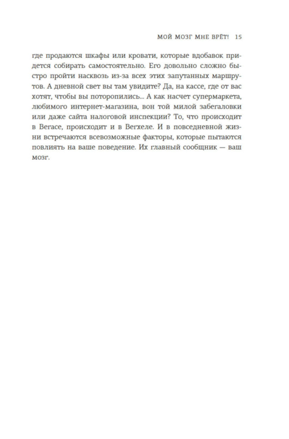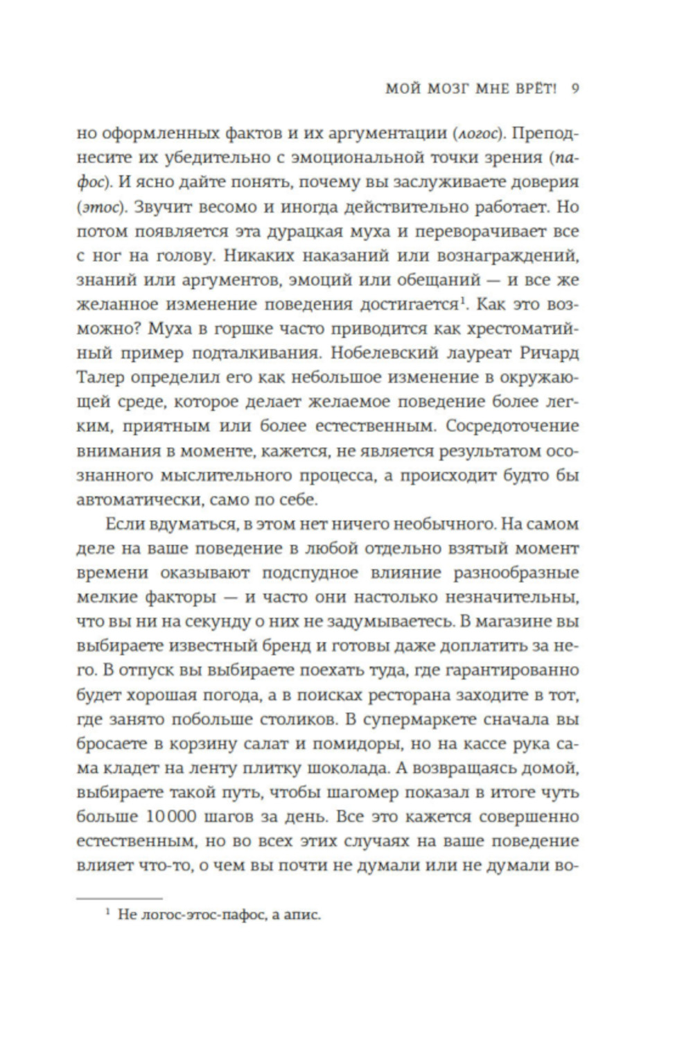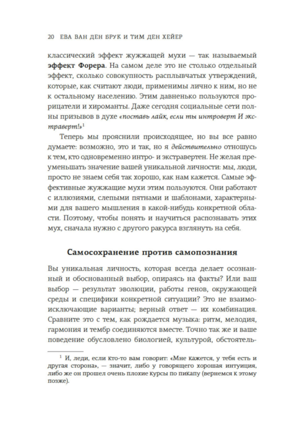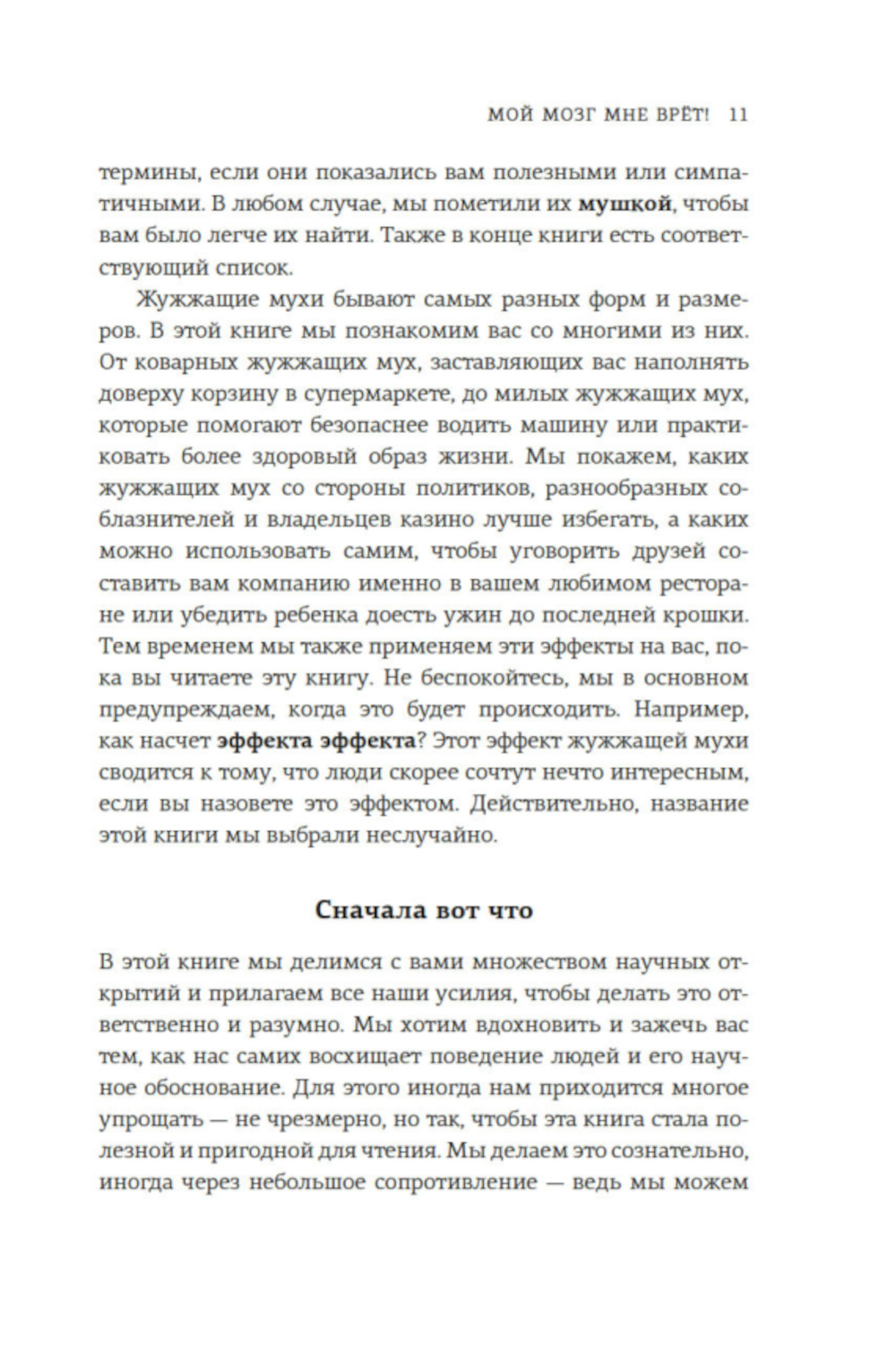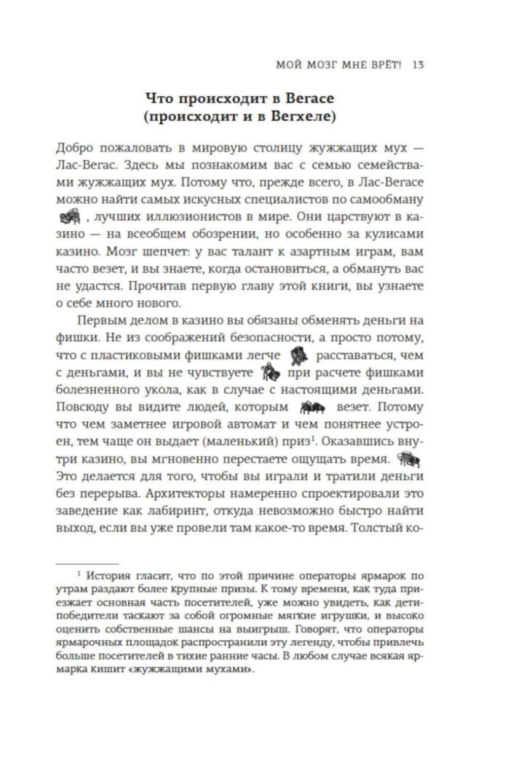 Может ли нарисованная на унитазе муха сэкономить вам деньги на уборке? Почему покупателя в супермаркете встречает именно овощной отдел? И как простой ворс из сушилки помогает пикаперам знакомиться с женщинами? В своей жизни мы постоянно недооцениваем влияние малозначительных, казалось бы, вещей на поведение, мышление, восприятие действительности. Ваш мозг обманывает вас ежедневно, и известные специалисты в этой области, Ева ван ден Брук и Тим ден Хейер, расскажут, как именно. Проводником в этом занимательном путешествии выступит самая обыкновенная… жужжащая муха! Эффектом жужжащей мухи авторы называют различные когнитивные искажения и ошибки в мышлении, из-за которых мы боимся выходить из зоны комфорта, совершаем одни и те же ошибки в состоянии стресса и так сильно жаждем вписываться в социальные нормы. Жужжащая муха настигнет вас где угодно, от мишленовского ресторана до нотариальной конторы. Как и от мухи настоящей, от нее нигде не скрыться. Более того, ее эффекты часто используют маркетологи, политики, экономисты и многие другие, даже если вы этого не замечаете. На конкретных примерах из жизни и статистических данных авторы расскажут, как распознать эффекты жужжащей мухи в повседневной жизни, избежать их негативных последствий, справиться с соблазнами и предрассудками. Эта книга вручит вам мухобойку и научит не только принимать верные решения и здраво оценивать окружающую обстановку, но даже пользоваться ошибками мышления во благо.| Издательство | КоЛибри |