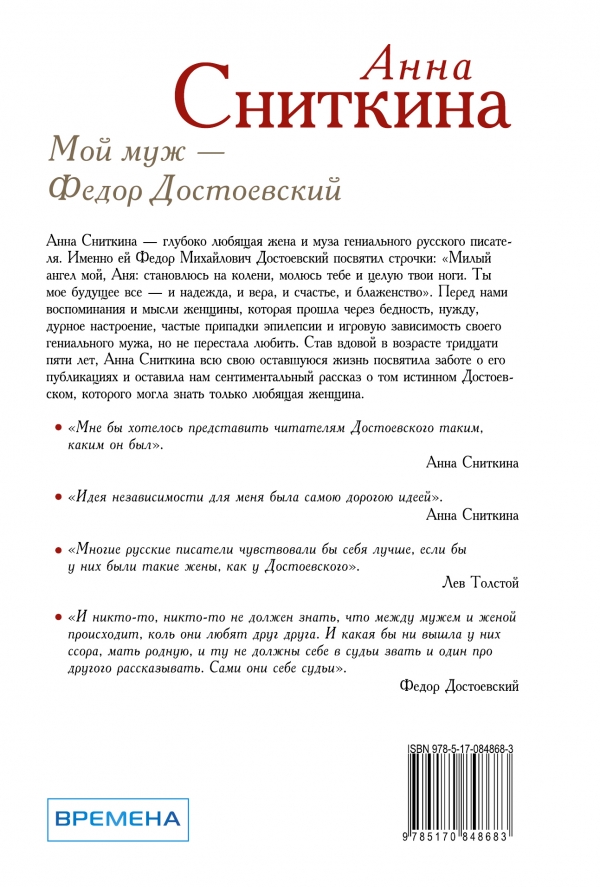 Анна Сниткина - глубоко любящая жена и муза гениального русского писателя. Именно ей Федор Михайлович Достоевский посвятил строчки: «Милый ангел мой, Аня: становлюсь на колени, молюсь тебе и целую твои ноги. Ты мое будущее все - и надежда, и вера, и счастье, и блаженство». Перед нами воспоминания и мысли женщины, которая прошла через бедность, нужду, дурное настроение, частые припадки эпилепсии и игровую зависимость своего гениального мужа, но не перестала любить. Став вдовой в возрасте тридцати пяти лет, Анна Сниткина всю свою оставшуюся жизнь посвятила заботе о его публикациях и оставила нам сентиментальный рассказ о том истинном Достоевском, которого могла знать только любящая женщина.
