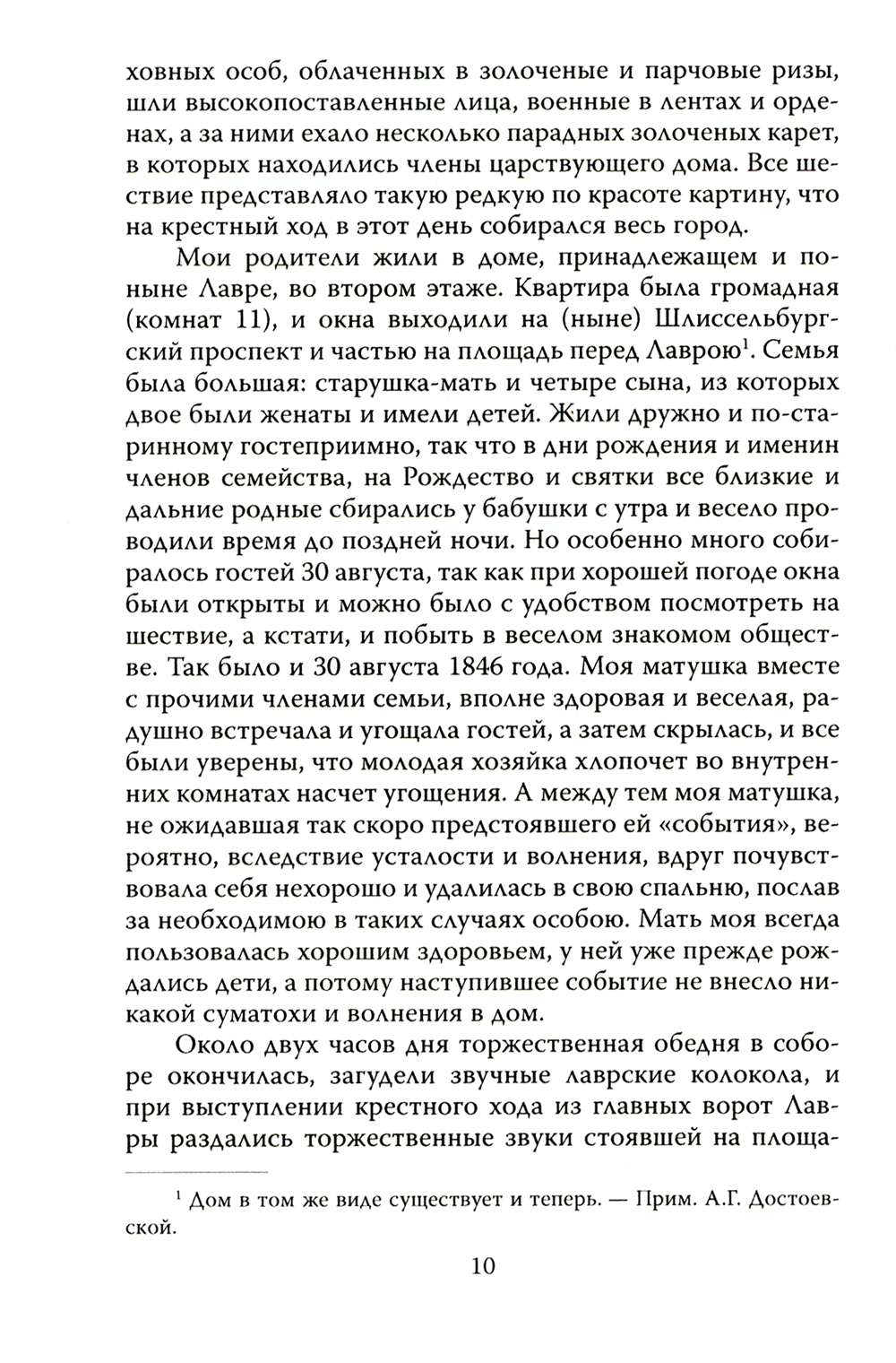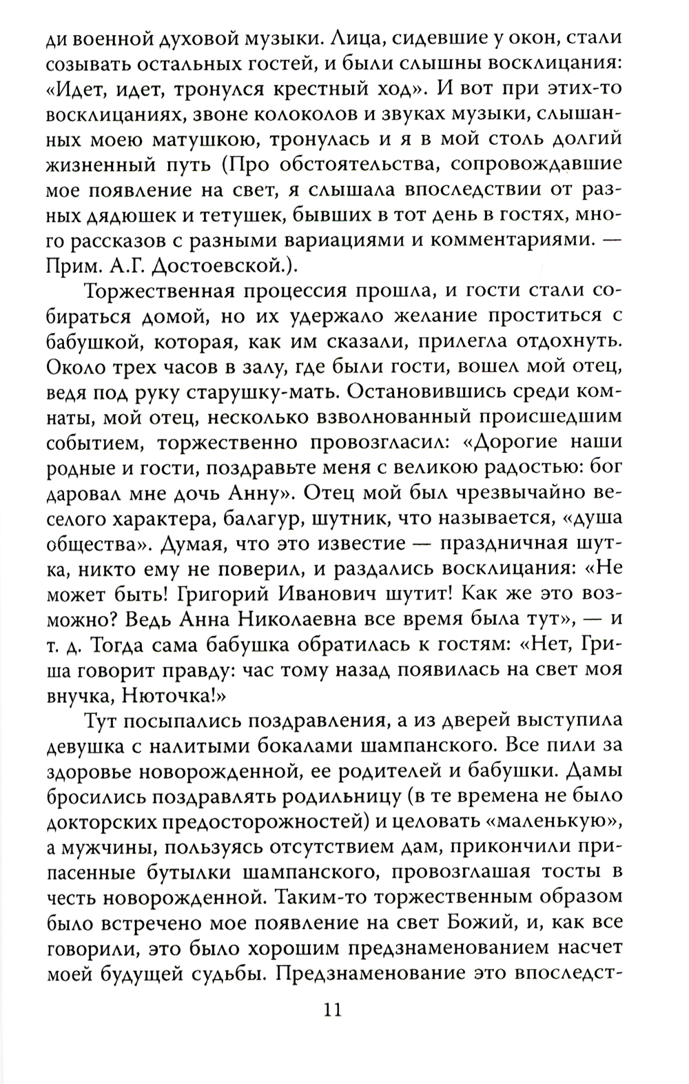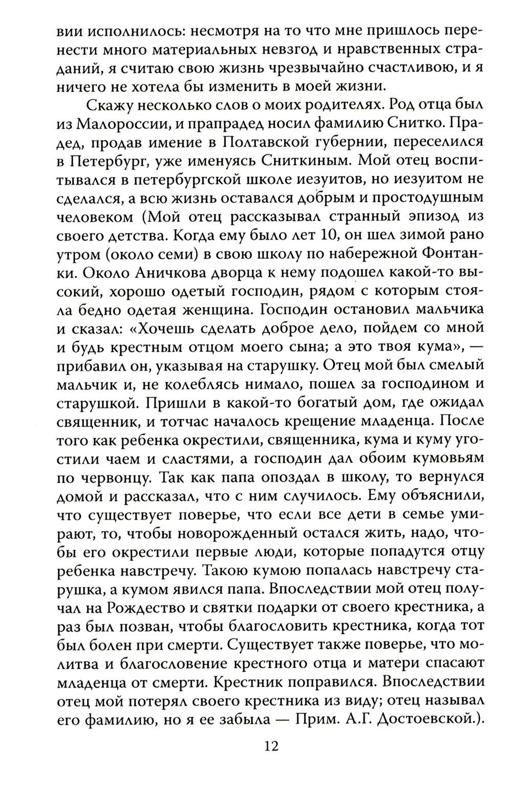 Перед нами воспоминания и мысли женщины, которая прошла через бедность, нужду, дурное настроение, частые припадки эпилепсии и игровую зависимость своего гениального мужа, но не перестала любить. Став вдовой в возрасте тридцати пяти лет, Анна Достоевская всю свою оставшуюся жизнь посвятила заботе о его публикациях и оставила нам сентиментальный рассказ о том истинном Достоевском, которого могла знать только любящая женщина. Рассказ о семьянине, любящем муже, заботливом и нежном отце - главная тема мемуаров его жены.