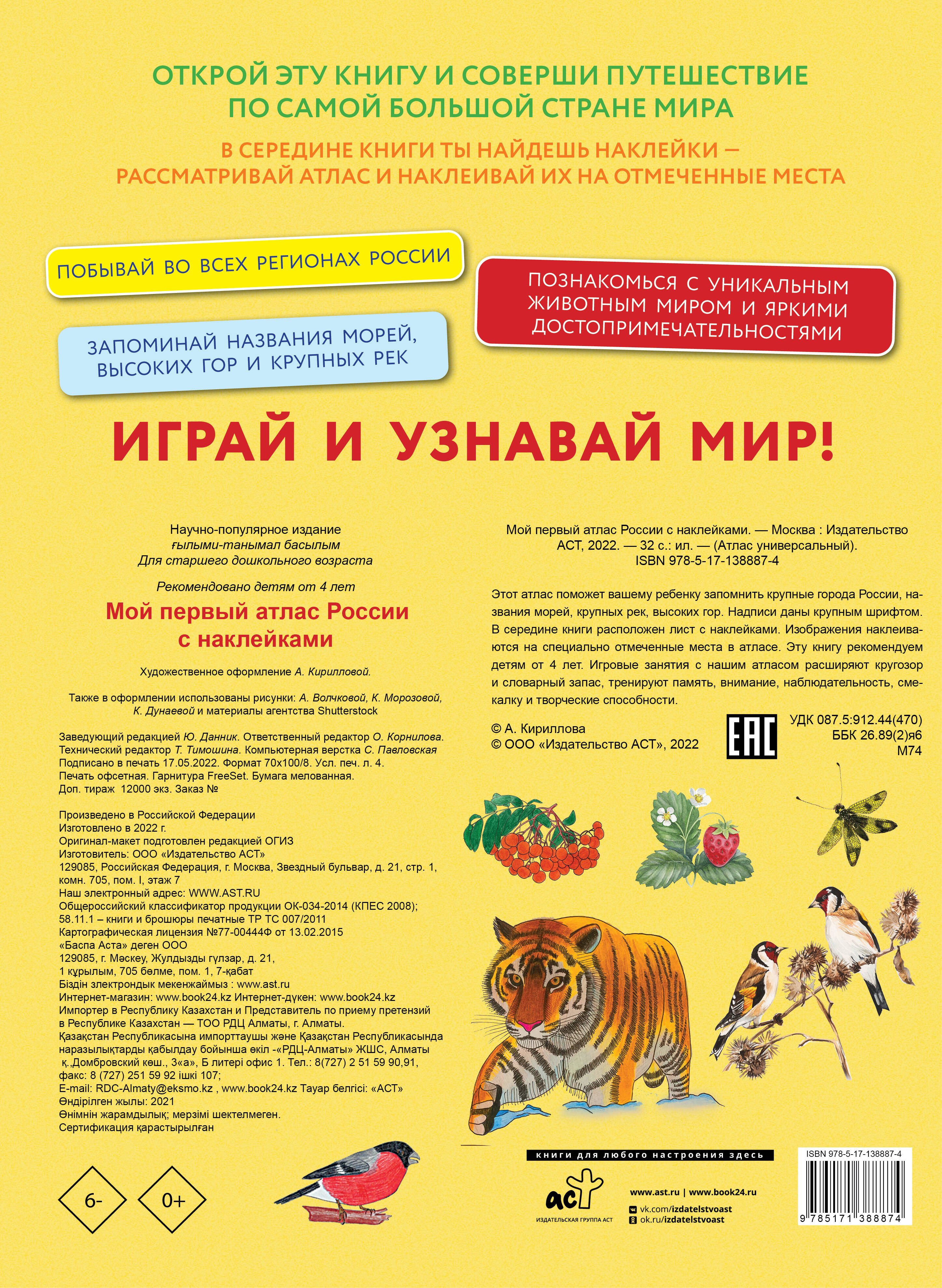 Открой атлас и соверши путешествие по самой большой стране мира. Этот атлас поможет вашему ребенку запомнить крупные города России, названия морей, крупных рек, высоких гор. Все надписи даны крупным шрифтом. В середине книги расположен лист с наклейками. Изображения наклеиваются на специально отмеченные места в атласе. Эту книгу рекомендуем детям от 4 лет. Игровые занятия с нашим атласом расширяют кругозор и словарный запас, тренируют память, внимание, наблюдательность, смекалку и творческие способности.| Издательство | Издательство "АСТ" |