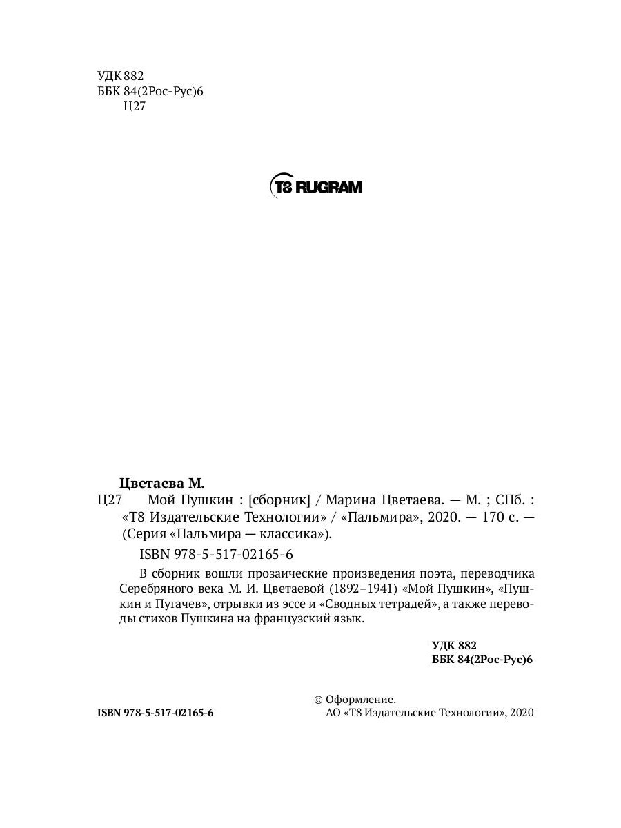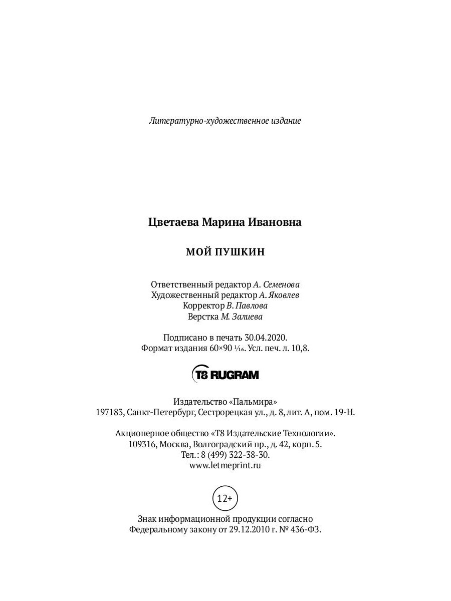 В сборник вошли прозаические произведения поэта, переводчика Серебряного века М.И. Цветаевой (1892-1941) «Мой Пушкин», «Пушкин и Пугачев», отрывки из эссе и «Сводных тетрадей», а также переводы стихов Пушкина на французский язык.