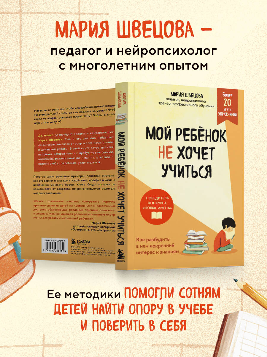 Можно ли сделать так, чтобы ваш ребёнок по-настоящему захотел учиться? Чтобы он сам садился за уроки? Чтобы горел от азарта, осваивая новую тему? Чтобы в классе первым тянул руку? Да, можно, утверждает педагог и нейропсихолог Мария Швецова. Уже много лет она избавляет семьи своих клиентов от ссор и слез из-за оценок и домашней работы. В этой книге автор делится методикой, которая помогает пробудить внутреннюю мотивацию, развить внимание и память, а главное - сделать учебу для ребенка увлекательной. Простые шаги, реальные примеры, понятная система - все это вернет в ваш дом спокойствие, доверие и желание школьника узнавать новое. Книга будет полезна вне зависимости от возраста, но особенно рекомендуется родителям младших школьников. «Книга, призванная наконец искоренить порочную практику деления детей на "успешных" и "двоечников", доступно объясняющая реальные причины сложностей в школе, а главное, дающая родителям понятные инструменты для работы с мотивацией ребенка». - Мария Шаталова, детский психолог, автор книги «Осторожно, это мои границы!»| Издательство | ООО "Издательство "Эксмо" |