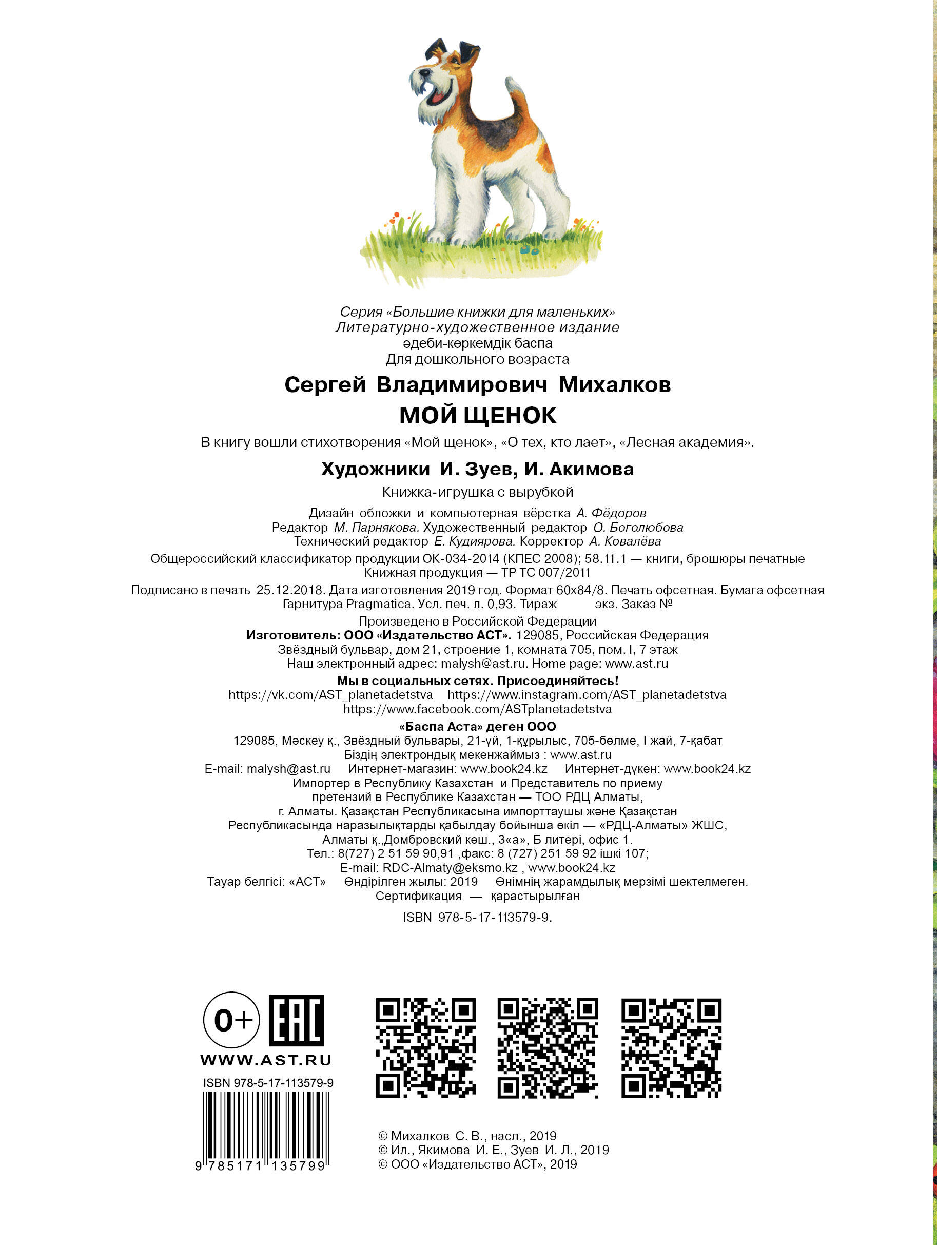 В книгу Сергея Михалкова вошли три замечательных стихотворения - "Мой щенок", "О тех, кто лает" и "Лесная академия". Девочкам и мальчикам обязательно понравятся эти знаменитые произведения и большие красивые картинки к ним!| Издательство | ИЗДАТЕЛЬСТВО "АСТ" |
