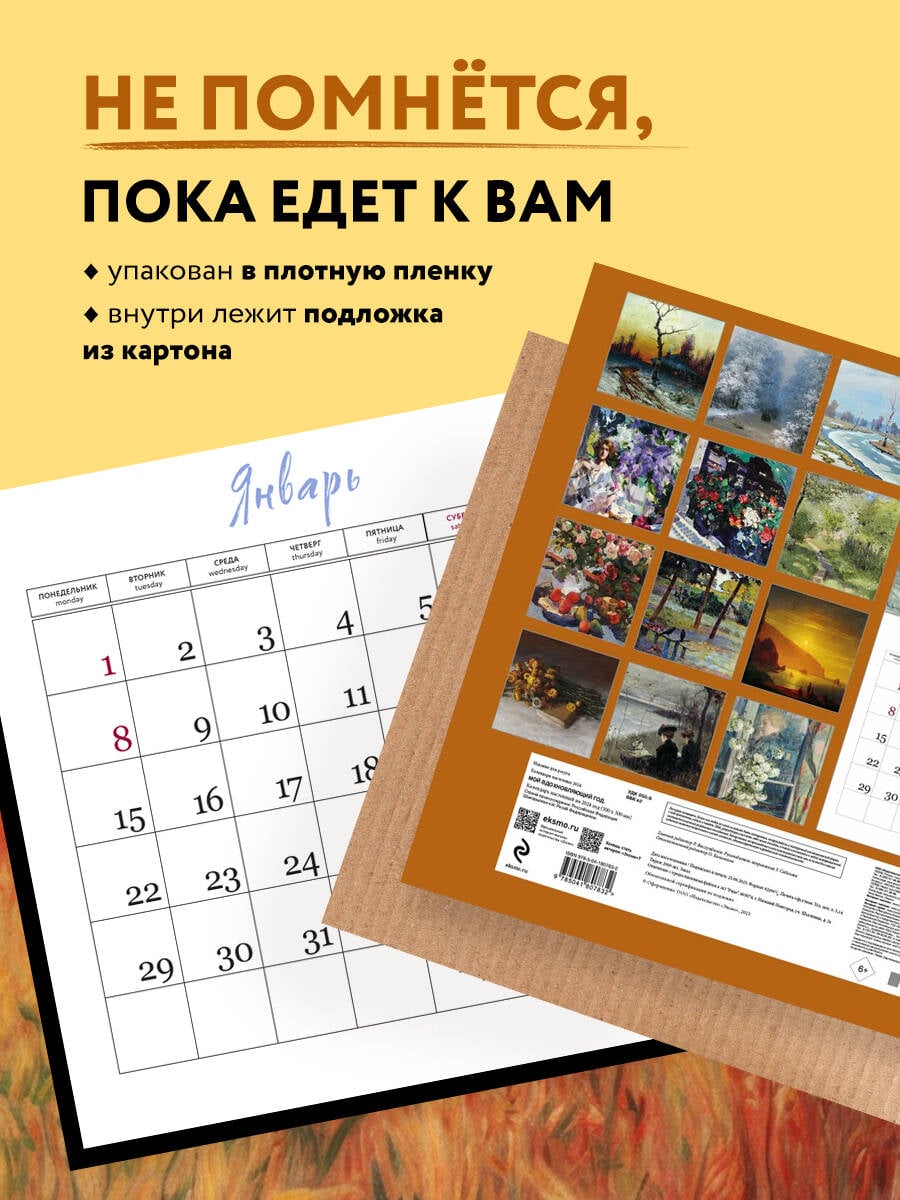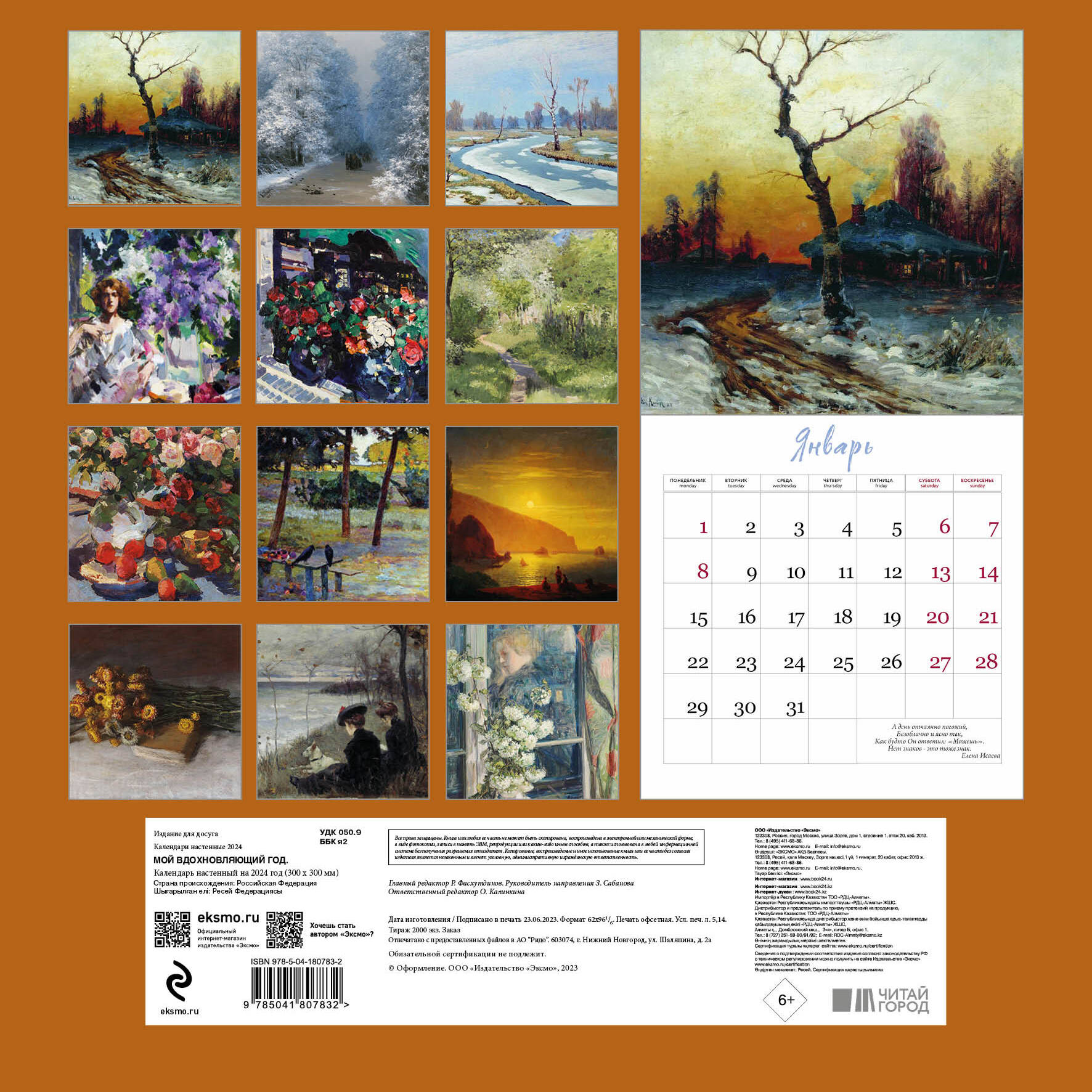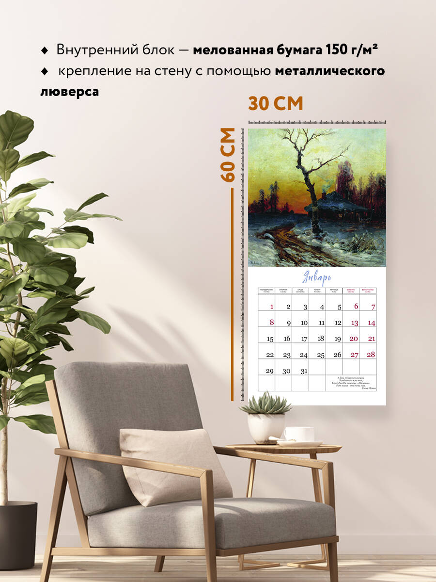 О серии: Наши настенные календари отличаются высоким качеством исполнения! Тщательно подобранные иллюстрации, напечатанные на глянцевой бумаге высочайшего качества, станут настоящим украшением дома, а в календарной сетке найдется место для ваших планов: большие клетки позволят делать записи и организовать свой год! В календаре также отмечены все государственные праздники. В серии настенных календарей издательства «ЭКСМО» каждый найдет тему по вкусу: великие художники, великолепные подборки с самыми знаменитыми произведениями искусства, легендарные кинематографические саги и игры, главные книжные авторы и бестселлеры, фотографии и иллюстрации любимых животных и многое-многое другое! О календаре: Каждый месяц картина выдающегося художника и вдохновляющее, мотивирующее стихотворение великого русского поэта. Календарь станет отличным подарком ценителям поэзии и искусства. Технические параметры: Тип календаря - настенный перекидной. Год - 2024. Календарная сетка - с разбивкой по месяцам. Вид скрепления - скрепка. Ширина - 30 см. Высота - 30 см. Внутренний блок - мелованная бумага 150 г/м2. Подложка - плотный гофрокартон для поддержания формы. Индивидуальная упаковка в плотный целлофановый пакет.| Издательство | ООО "Издательство "Эксмо" |