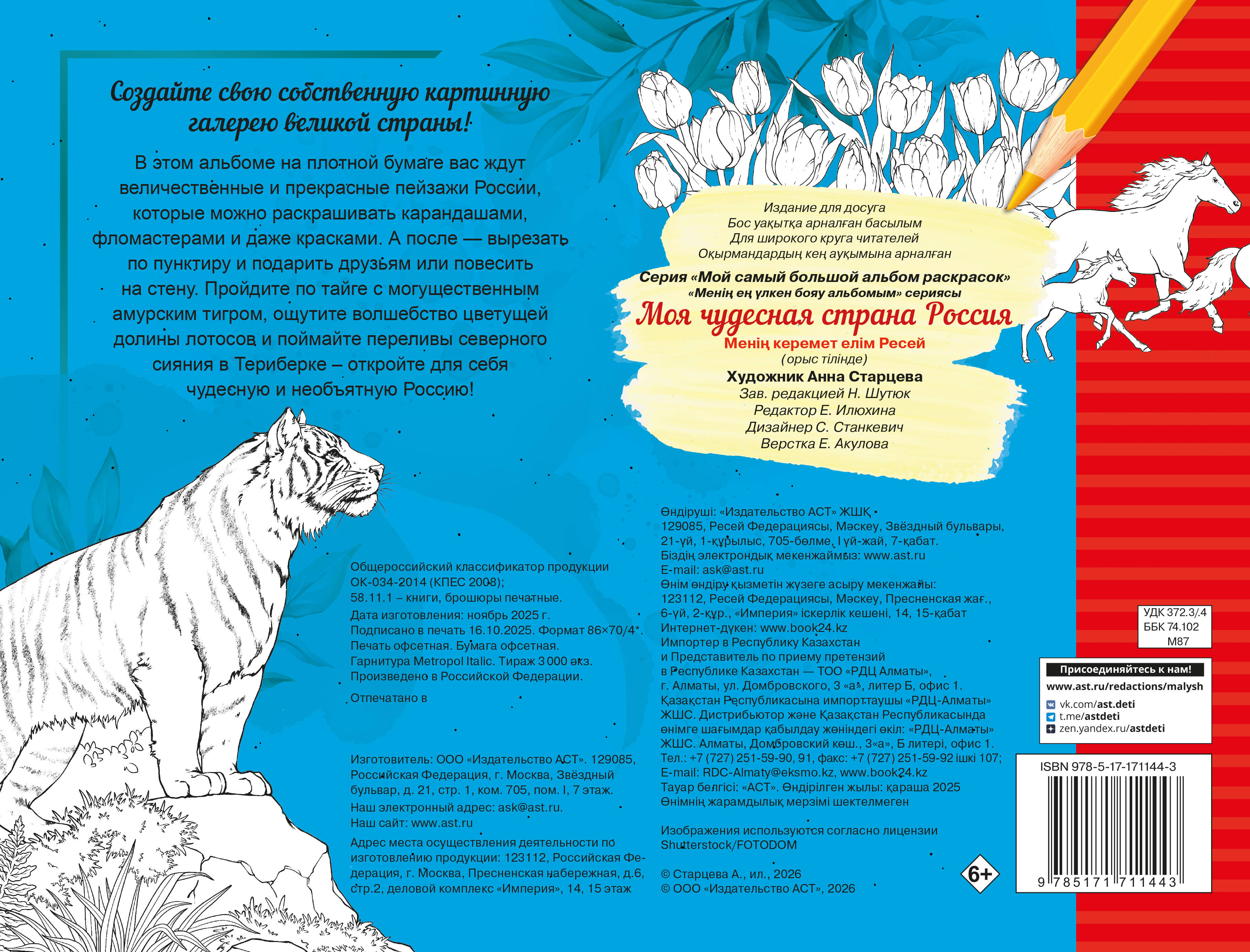 Создайте свою собственную картинную галерею великой страны! В этом альбоме на плотной бумаге вас ждут величественные и прекрасные пейзажи России, которые можно раскрашивать карандашами, фломастерами и даже красками. А после - вырезать по пунктиру и подарить друзьям или повесить на стену. Пройдите по тайге с могущественным амурским тигром, ощутите волшебство цветущей долины лотосов и поймайте переливы северного сияния в Териберке - откройте для себя чудесную и необъятную Россию!| Издательство | Издательство "АСТ" |