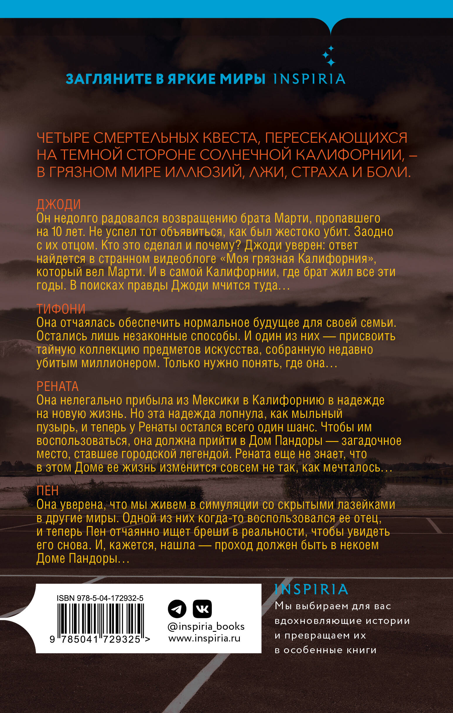 Четыре смертельных квеста, пересекающихся на темной стороне солнечной Калифорнии - в грязном мире иллюзий, лжи, страха и боли. Джоди Он недолго радовался возвращению брата Марти, пропавшего на 10 лет. Не успел тот объявиться, как был жестоко убит. Заодно с их отцом. Кто это сделал и почему? Джоди уверен - ответ найдется в странном видеоблоге «Моя грязная Калифорния», который вел Марти. И в самой Калифорнии, где брат жил все эти годы. В поисках правды Джоди мчится туда… Тифони Она отчаялась обеспечить нормальное будущее для своей семьи. Остались лишь незаконные способы. И один из них - присвоить тайную коллекцию предметов искусства, собранную недавно убитым миллионером. Только нужно понять, где она… Рената Она нелегально прибыла из Мексики в Калифорнию, в надежде на новую жизнь. Но эта надежда лопнула, как мыльный пузырь, и теперь у Ренаты остался всего один шанс. Чтобы им воспользоваться, она должна прийти в Дом Пандоры - загадочное место, ставшее городской легендой. Рената еще не знает, что в этом Доме ее жизнь изменится совсем не так, как мечталось… Пен Она уверена, что мы живем в симуляции со скрытыми лазейками в другие миры. Одной из них когда-то воспользовался ее отец, и теперь Пен отчаянно ищет бреши в реальности, чтобы увидеть его снова. И, кажется, нашла - проход должен быть в некоем Доме Пандоры… ___________________________________________________________________ «Мосберг замысловато сплел несколько тайн воедино в этом захватывающем сочетании триллера с большой прозой». - Меган Миранда| Издательство | ООО "Издательство "Эксмо" |