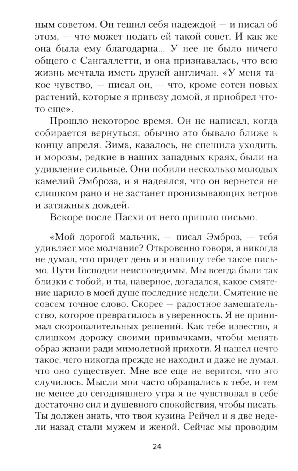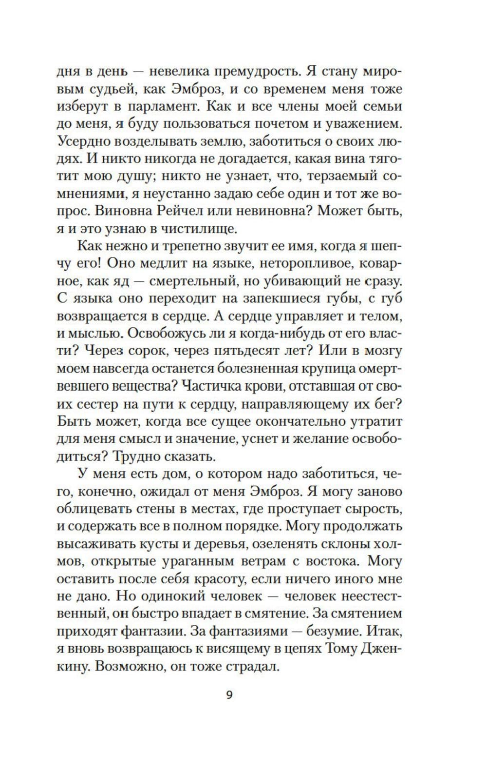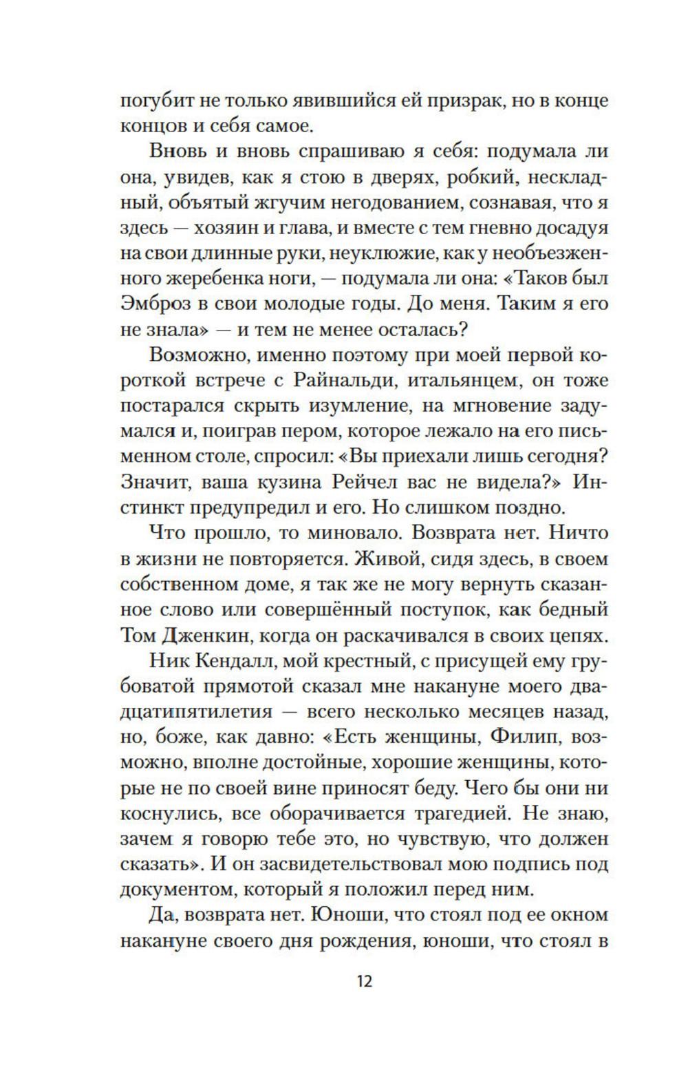Роман «Моя кузина Рейчел», по мнению многих критиков и поклонников английской писательницы Дафны Дюморье (1907-1989), не уступает прославленной «Ребекке», а в чем-то и превосходит ее. Детективная интрига сочетается с необычной любовной драмой, которая разворачивается на фоне завораживающих пейзажей Корнуолла и живописных картин Италии середины XIX века. Главная героиня - загадочная, непостижимая Рейчел - один из самых запоминающихся образов в английской литературе. С каждым поворотом сюжета читатель все больше теряется в догадках, кто перед ним - жертва несправедливых подозрений или расчетливая интриганка и убийца... Роман был издан в 1951 году и мгновенно стал бестселлером, а всего через год на экраны вышел одноименный фильм с Оливией де Хэвиленд и молодым Ричардом Бартоном, впоследствии по роману был снят телевизионный сериал, а в 2017 году состоялась новая экранизация с Рейчел Вайс и Сэмом Клафлином в главных ролях.| Издательство | Азбука |