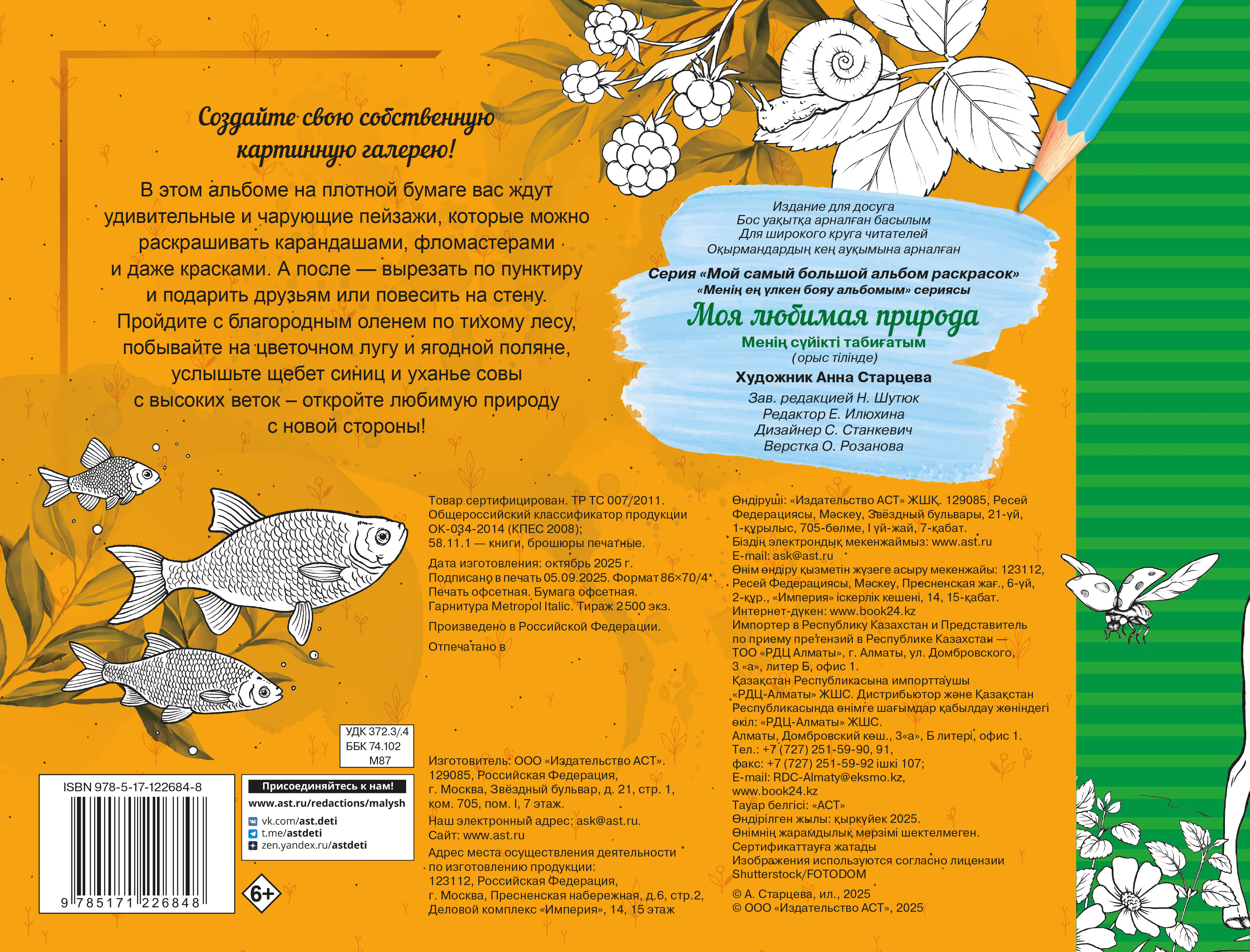 Создайте свою собственную картинную галерею! В этом альбоме на плотной бумаге вас ждут удивительные и чарующие пейзажи, которые можно раскрашивать карандашами, фломастерами и даже красками. А после - вырезать по пунктиру и подарить друзьям или повесить на стену. Пройдите с благородным оленем по тихому лесу, побывайте на цветочном лугу и ягодной поляне, услышьте щебет синиц и уханье совы с высоких веток - откройте любимую природу с новой стороны!| Издательство | Издательство "АСТ" |