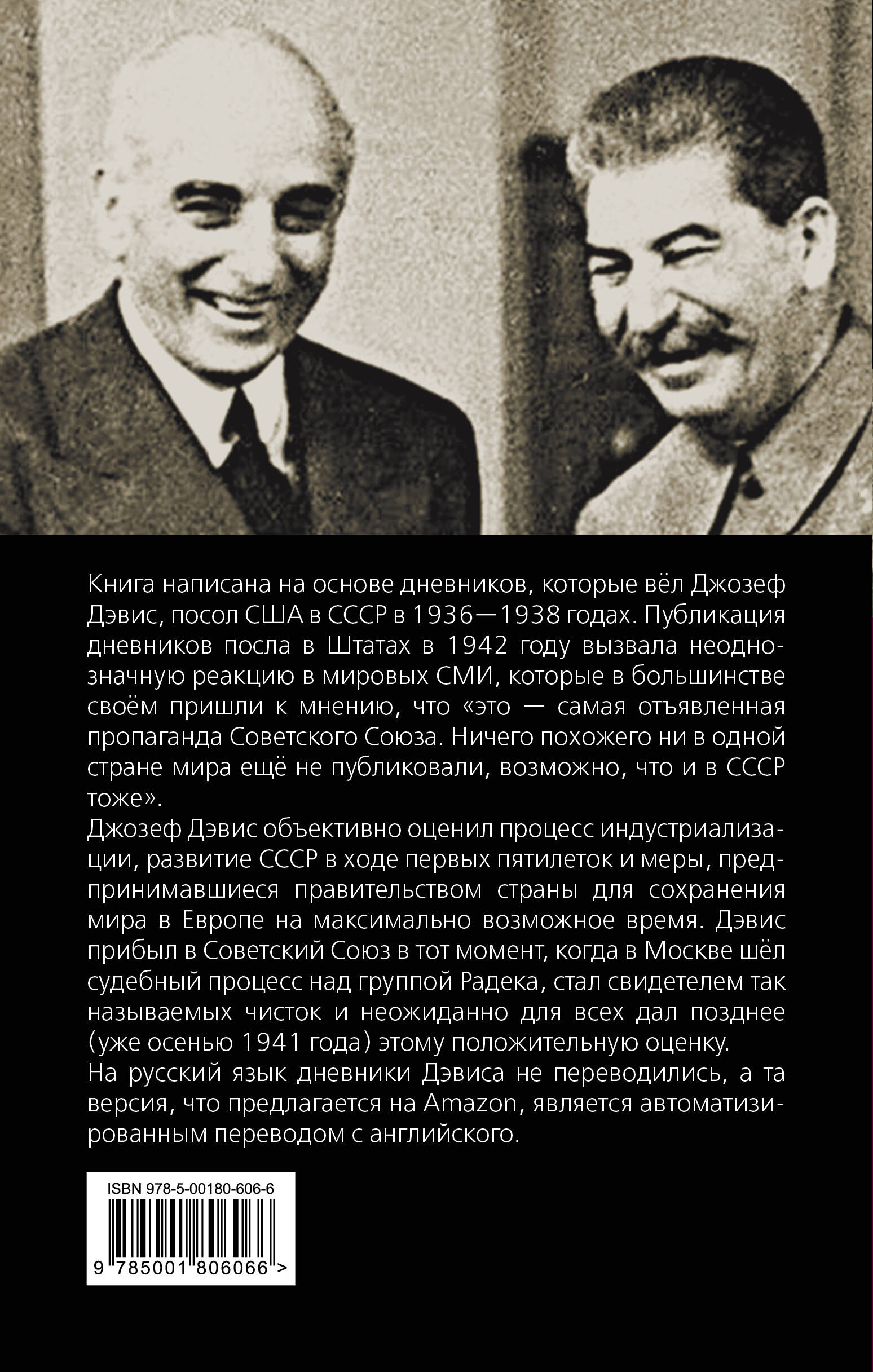 Книга написана на основе дневников, которые вел Джозеф Дэвис, посол США в СССР в 1936-1938 гг. Публикация дневников посла в Штатах в 1942 году вызвала неоднозначную реакцию в мировых СМИ, которые в большинстве своём пришли к мнению, что «это - самая отъявленная пропаганда Советского Союза. Ничего похожего ни в одной стране мира ещё не публиковали, возможно, что и в СССР тоже». Джозеф Дэвис объективно оценил процесс индустриализации, развитие СССР в ходе первых пятилеток и меры, предпринимавшиеся правительством страны для сохранения мира в Европе на максимально возможное время. Дэвис прибыл в Советский Союз в тот момент, когда в Москве шёл судебный процесс над группой Радека, стал свидетелем так называемых «чисток» и неожиданно для всех дал позднее (уже осенью 1941 года) этому положительную оценку. На русский язык дневники Дэвиса не переводились, а та версия, что предлагается на Amazon, является автоматизированным переводом с английского.| Издательство | Родина Издательство ООО |
