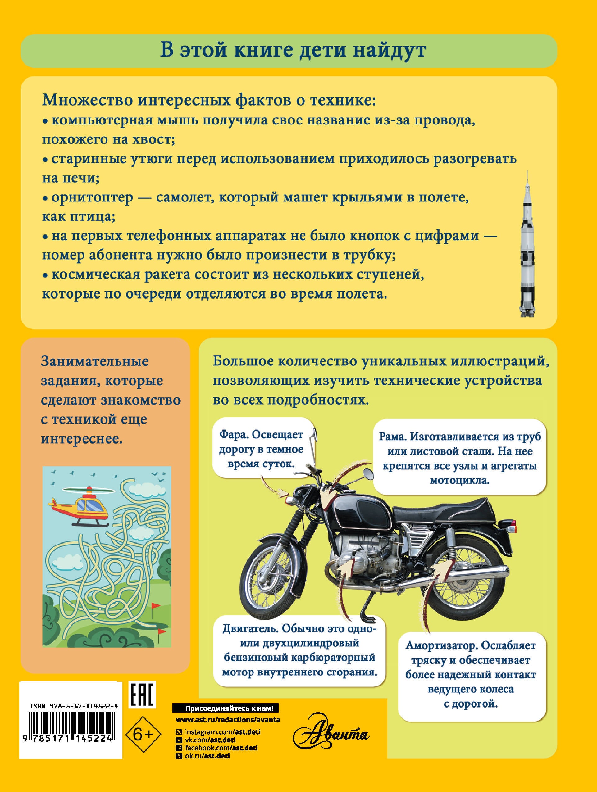 В этой книге дети найдут Множество интересных фактов о технике: компьютерная мышь получила свое название из-за провода, похожего на хвост; старинные утюги перед использованием приходилось разогревать на печи; орнитоптер - самолет, который машет крыльями в полете, как птица; на первых телефонных аппаратах не было кнопок с цифрами - номер абонента нужно было произнести в трубку; космическая ракета состоит из нескольких ступеней, которые по очереди отделяются во время полета. Занимательные задания, которые сделают знакомство с техникой еще интереснее. Большое количество уникальных иллюстраций, позволяющих изучить технические устройства во всех подробностях. Фара. Освещает дорогу в темное время суток. Рама. Изготавливается из труб или листовой стали. На нее крепятся все узлы и агрегаты мотоцикла. Двигатель. Обычно это одно- или двухцилиндровый бензиновый карбюраторный мотор внутреннего сгорания. Амортизатор. Ослабляет тряску и обеспечивает более надежный контакт ведущего колеса с дорогой.| Издательство | ИЗДАТЕЛЬСТВО "АСТ" |