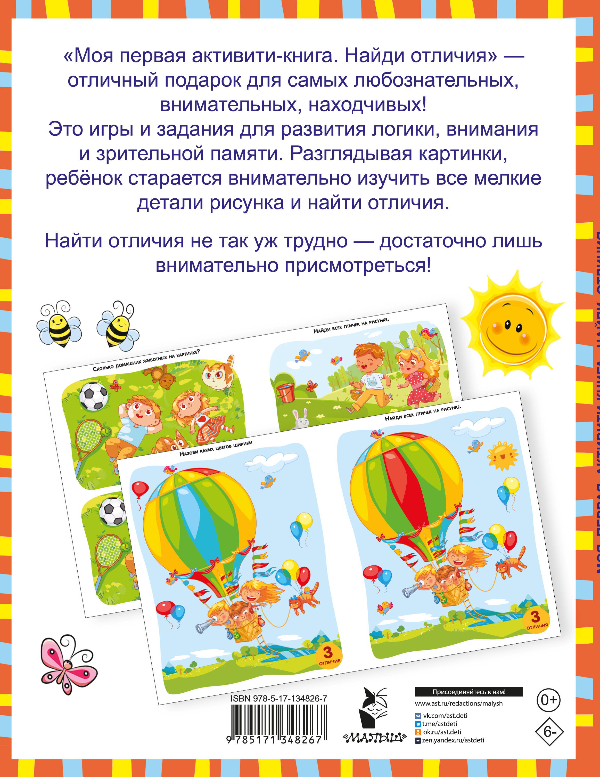 О чем эта книга «Моя первая книга. Найди отличия» - это сборник заданий для развития внимания и зрительной памяти, выработки усидчивости, терпения и аккуратности. Разглядывая картинки и находя отличия, ребёнок старается присмотреться, внимательно изучить все детали рисунка. Кому эта книга будет интересна Книжка порадует дошкольников и принесёт немало пользы, ведь поиск отличий - это одновременно и весёлая игра, и эффективная тренировка внимания. Каковы особенности этой книги • Множество интересных заданий на развитие аналитических способностей. • Находить отличия - увлекательно и очень полезно. Ребёнок развивает зрительное восприятие и внимание, тренирует память и воображение. • Совместные занятия по книге - отличный способ установить доверительные отношения с ребёнком. Найти отличия не так уж трудно - достаточно лишь внимательно присмотреться!| Издательство | ИЗДАТЕЛЬСТВО "АСТ" |