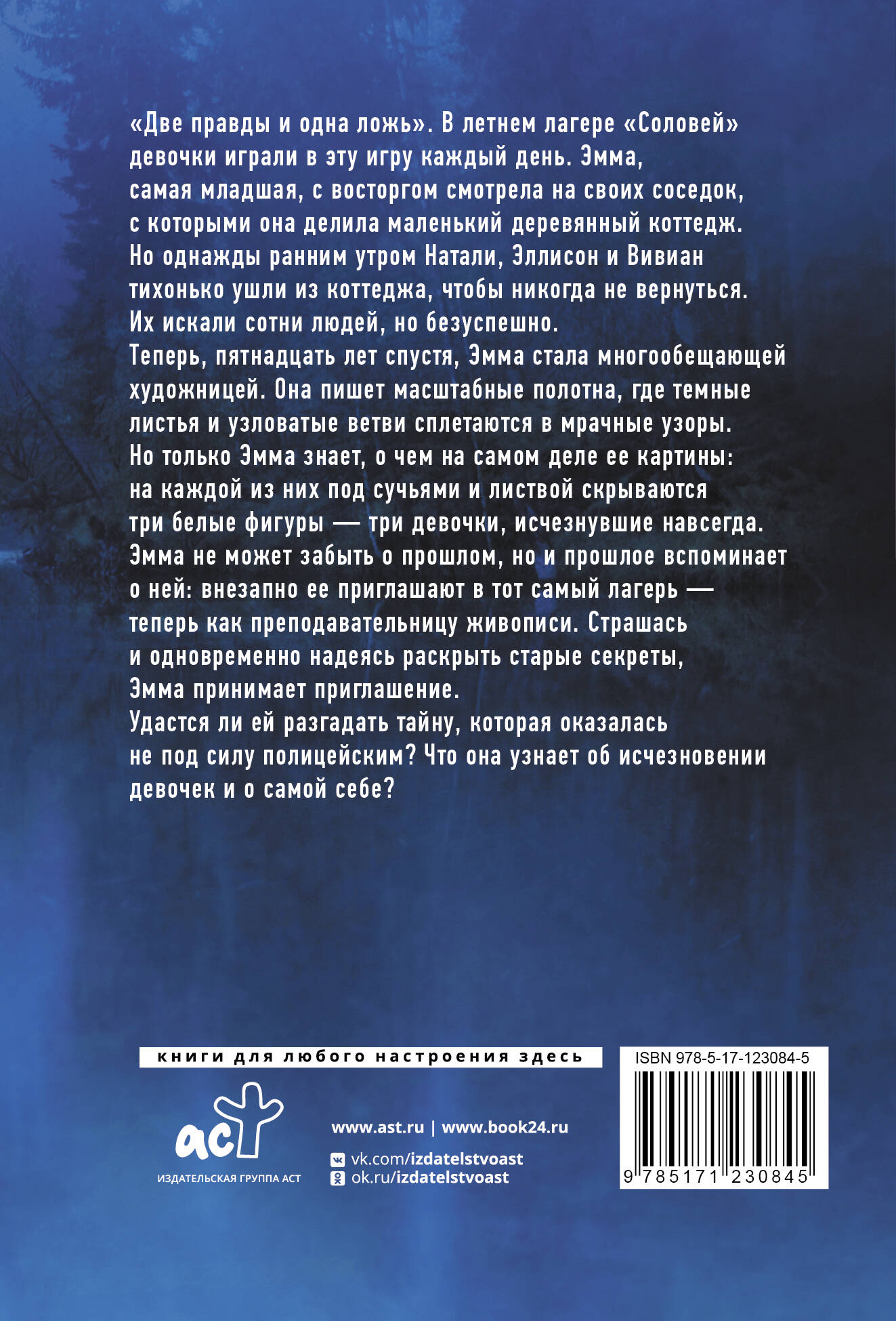 "Две правды и одна ложь". В летнем лагере "Соловей" девочки играли в эту игру каждый день. Эмма, самая младшая, с восторгом смотрела на своих соседок, с которыми она делила маленький деревянный коттедж. Но однажды ранним утром Натали, Эллисон и Вивиан тихонько ушли из коттеджа, чтобы никогда не вернуться. Их искали сотни людей, но безуспешно. Теперь, пятнадцать лет спустя, Эмма стала многообещающей художницей. Она пишет масштабные полотна, где темные листья и узловатые ветви сплетаются в мрачные узоры. Но только Эмма знает, о чем на самом деле ее картины: на каждой из них под сучьями и листвой скрываются три белые фигуры - три девочки, исчезнувшие навсегда. Эмма не может забыть о прошлом, но и прошлое вспоминает о ней: внезапно ее приглашают в тот самый лагерь - теперь как преподавательницу живописи. Страшась и одновременно надеясь раскрыть старые секреты, Эмма принимает приглашение. Удастся ли ей разгадать тайну, которая оказалась не под силу полицейским? Что она узнает об исчезновении девочек и о самой себе?