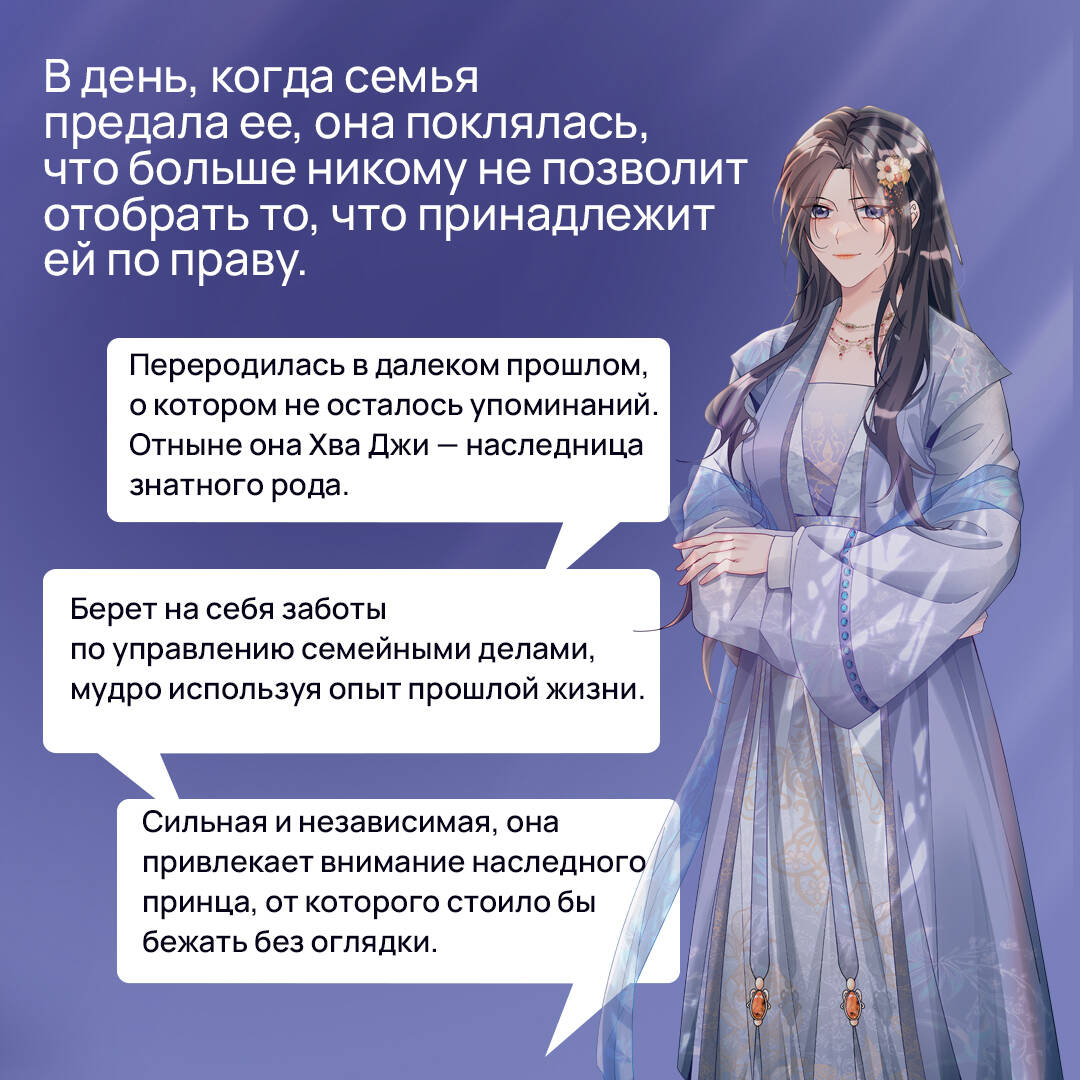 Новая историческая исекай-манхва «Моя прекрасная Хва Джи» набирает популярность по всему миру! Станьте одними из первых, кто узнает историю перерождения Хва Джи за тысячу лет до нашего времени. Хва Имджи, глава крупной семейной компании, вела непрерывную борьбу, чтобы защитить наследие своего отца. В день, когда семья предала ее, она поклялась, что больше никому не позволит отобрать то, что принадлежит ей по праву. Девушку убили ради денег, но вместо того, чтобы отправиться в загробный мир, Хва Имджи переродилась в далеком прошлом, о котором не осталось упоминаний. Отныне она Хва Джи - наследница знатного рода. Девушка надеялась, что интриги и предательства остались позади, но в одно мгновение семья Хва распалась, а мужчины оказались в изгнании по приказу императора. Хва Джи берет на себя заботы по управлению семейными делами, мудро используя опыт прошлой жизни. Сильная и независимая, она привлекает внимание наследного принца, от которого стоило бы бежать без оглядки. Адаптация китайской одноименной новеллы Kong Liu, в которой главная движущая сила - любовь. Чтобы вернуть свою семью и положение в обществе, Хва Джи ищет союзников в борьбе с безжалостным императором. Харизматичная, искренняя и самоотверженная главная героиня, дворцовые интриги, динамичный сюжет, эпоха, о которой не осталось записей, и исцеляющая душу любовь. Манхва будет напечатана на мелованной бумаге, с цветными форзацами и мерцающей фольгой на обложке.