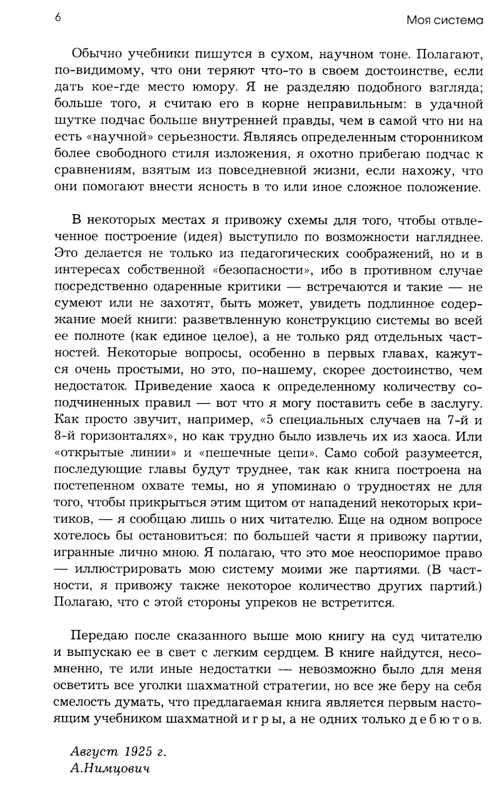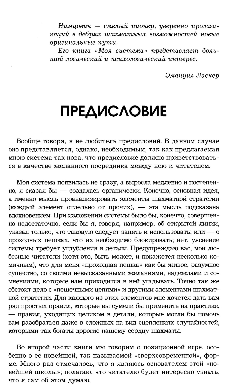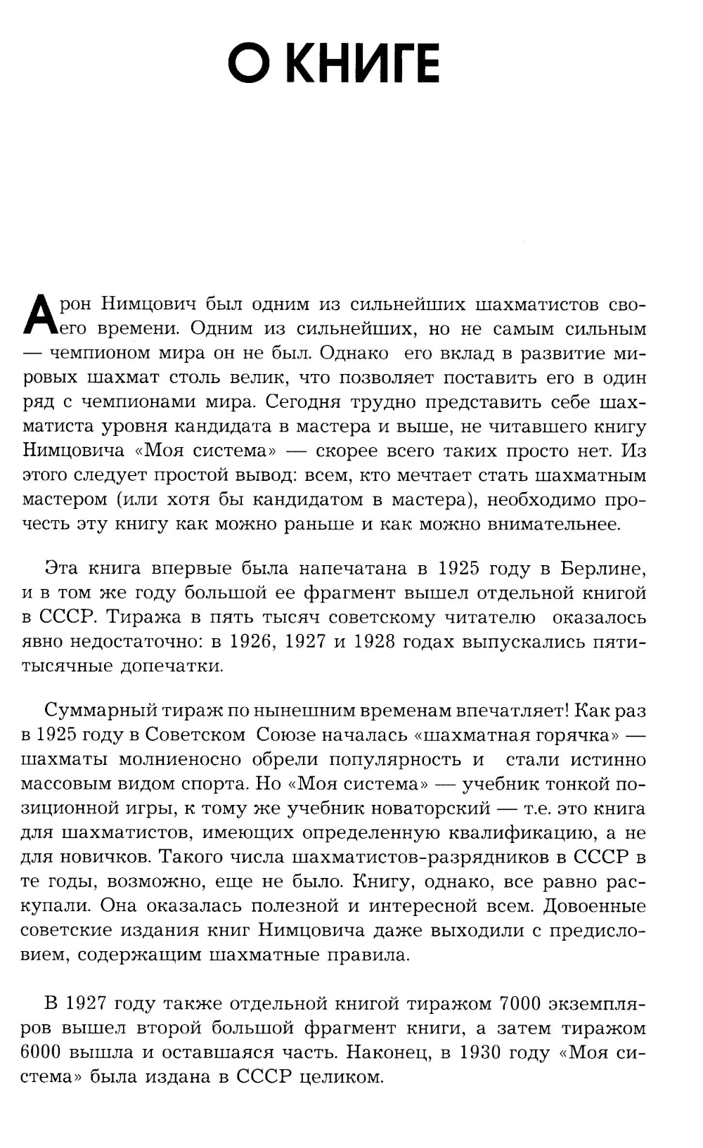 Арон Нимцович - один из сильнейших шахматистов своего времени. Его вклад в развитие мировых шахмат трудно переоценить - его соображения о фигурном центре, пешечных цепях, блокаде, профилактике, игре по полям одного цвета дали толчок целому шахматному движению, названному гипермодернизмом. Его идеи стоят за дебютной революцией XX века, и многие современные дебютные построения связаны с его именем. Нимцович был не только выдающимся шахматистом и глубоким шахматным мыслителем, но и блестящим педагогом. Его книги, написанные живым образным языком, стали настольными для многих поколений шахматистов, включая большинство чемпионов мира. «Моя система» - главная работа Нимцовича и настольная книга многих выдающихся шахматистов прошлого и настоящего. Книга необходима всем, кто хочет повысить свое шахматное мастерство и добиться новых турнирных побед, так как до сих пор нет достойной замены классическим трудам Арона Нимцовича.