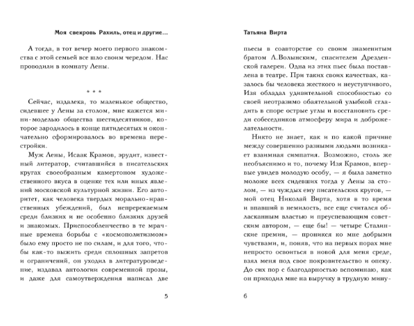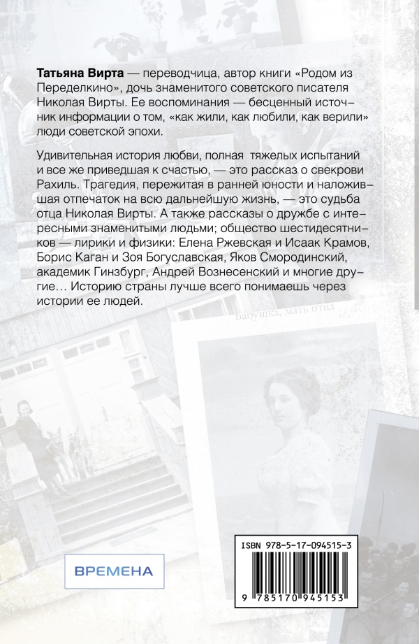Татьяна Вирта - переводчица, автор книги «Родом из Переделкино», дочь знаменитого советского писателя Николая Вирты. Ее воспоминания - бесценный источник информации о том, «как жили, как любили, как верили» люди советской эпохи. Удивительная история любви, полная тяжелых испытаний и все же приведшая к счастью - это рассказ о свекрови Рахиль. Трагедия, пережитая в ранней юности и наложившая отпечаток на всю дальнейшую жизнь - это судьба отца Николая Вирты. А также рассказы о дружбе с интересными знаменитыми людьми; общество шестидесятников - лирики и физики: Елена Ржевская и Исаак Крамов, Борис Каган и Зоя Богуславская, Яков Смородинский, академик Гинзбург и многие другие… Историю страны лучше всего понимаешь через истории ее людей.