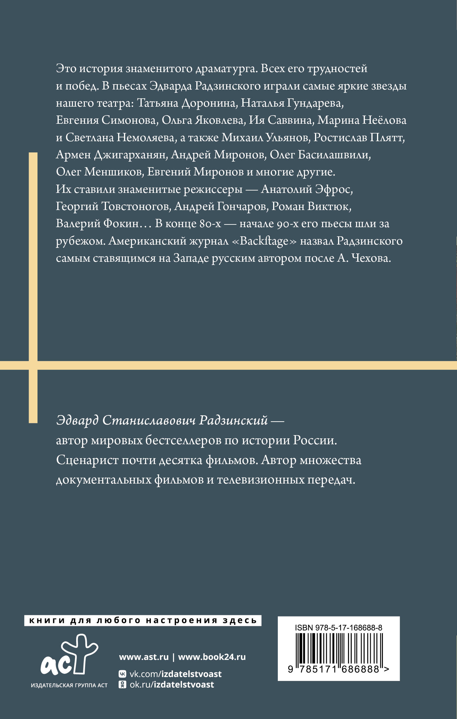 Это история знаменитого драматурга. Всех его трудностей и побед. В пьесах Эдварда Радзинского играли самые яркие звезды нашего театра: Татьяна Доронина, Наталья Гундарева, Евгения Симонова, Ольга Яковлева, Ия Саввина, Марина Неёлова и Светлана Немоляева, а также Михаил Ульянов, Ростислав Плятт, Армен Джигарханян, Андрей Миронов, Олег Басилашвили, Олег Меншиков, Евгений Миронов и многие другие. Их ставили знаменитые режиссеры - Анатолий Эфрос, Георгий Товстоногов, Андрей Гончаров, Роман Виктюк, Валерий Фокин… В конце 80-х - начале 90-х его пьесы шли за рубежом. Американский журнал "Backstage" назвал Радзинского самым ставящимся на западе русским автором после А. Чехова.| Издательство | Издательство "АСТ" |
