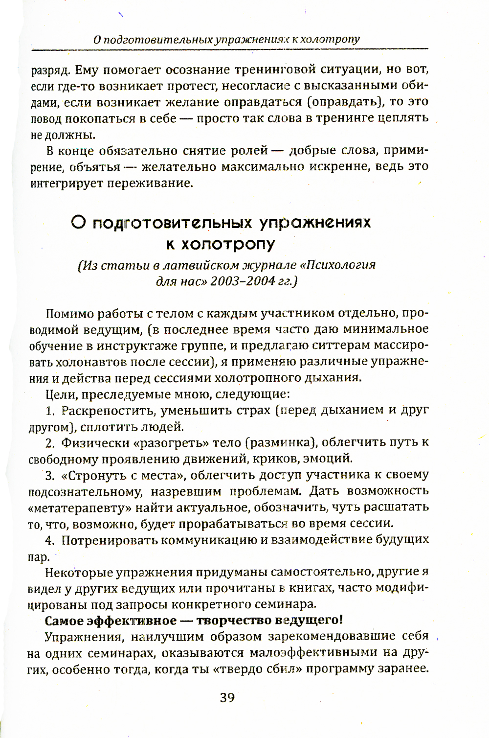 Известный трансперсональный психолог делится опытом проведения авторских психологических тренингов и упражнений, которые благодаря подробному описанию можно самостоятельно проводить на групповых занятиях, а иногда и в индивидуальной психологической работе. Мнения о холотропном дыхании и интенсивных дыхательных техниках разнятся. Автор не только даёт свою оценку профессионала, который за двадцать лет провёл около 800 семинаров холотропного дыхания в тридцати городах восьми стран мира, но и показывает эволюцию своих взглядов на холотропное дыхание, обнажая «скрытые пружины» данной техники. В книге помещены тексты выступлений на конференциях в Индии, в США и других странах, интересные интервью. Работа с глубинными слоями психики затрагивает пограничную область духовного и требует особой чуткости и душевной чистоты ведущего - вот главный тезис, которым руководствовался автор, и к чему призывает других.
