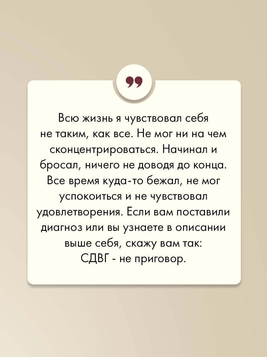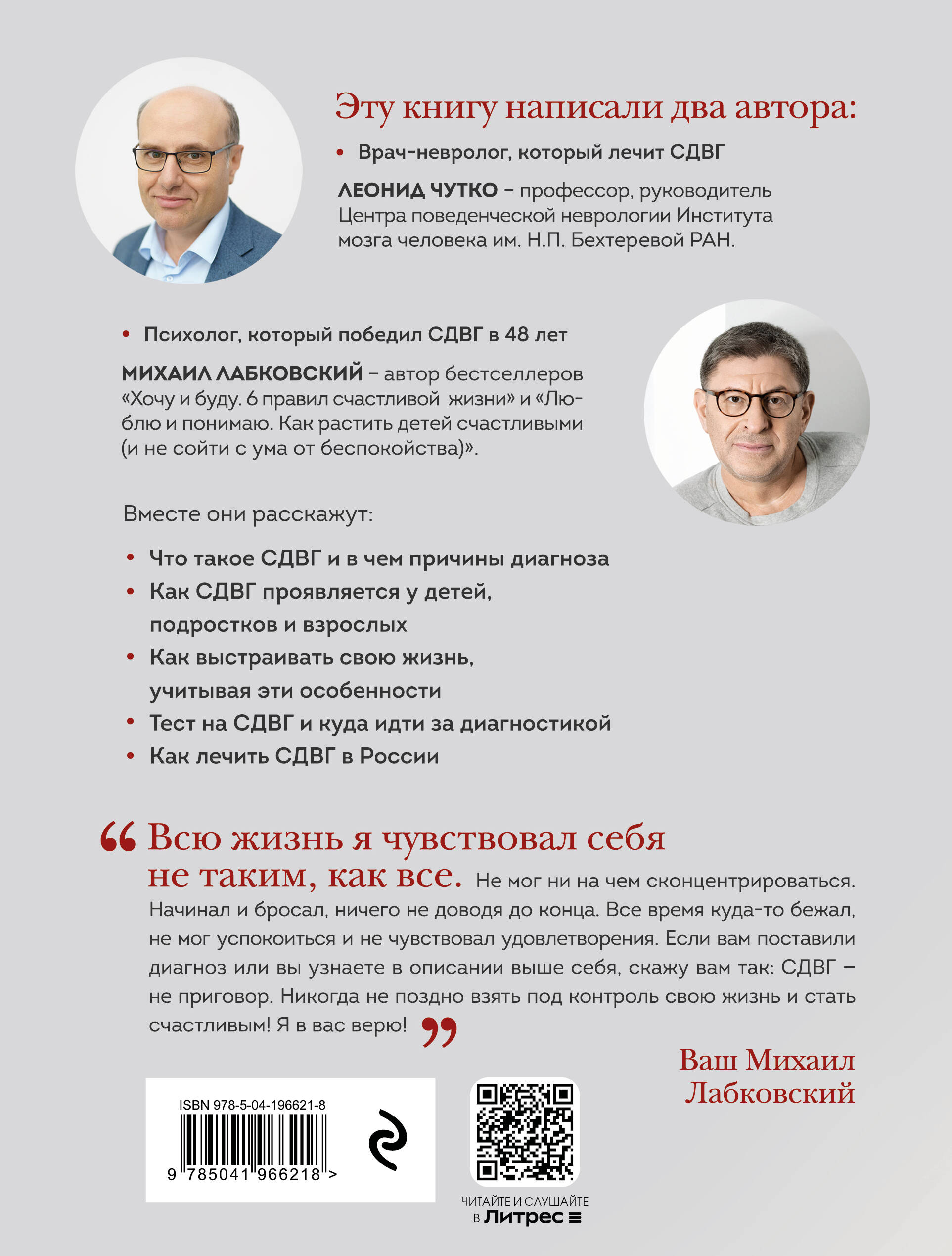 «СВДГ - не приговор. Ваша жизнь, как и моя, заиграет новыми красками». Всю жизнь я чувствовал себя не таким, как все: • не мог ни на чем сконцентрироваться; • не мог усидеть на месте; • начинал и бросал, ничего не доводя до конца; • был вспыльчивым и обидчивым; • легко впадал в зависимости; • все время куда-то бежал, не мог успокоиться и не чувствовал удовлетворения. Если вам поставили диагноз или вы узнаете в описании выше себя, скажу вам так: СДВГ - не приговор. Эту книгу я написал вместе с ведущим специалистом в этой области, врачом-неврологом, который лечит СДВГ, тики, речевые нарушения и руководит Центром поведенческой неврологии Института мозга человека им. Н.П. Бехтеревой, профессором Леонидом Чутко. Вместе мы расскажем: • Что такое СДВГ и в чем причины диагноза? • Как СДВГ проявляется у детей, подростков и взрослых? • Как выстраивать свою жизнь, учитывая эти особенности? • Тест на СДВГ и куда идти за диагностикой? • Как лечить СДВГ в России? Я сам - живой пример того, как с СДВГ в тяжелой форме в анамнезе можно взять свое заболевание под контроль и чувствовать себя прекрасно. Реализовать себя в интересном деле, зарабатывать хорошие деньги, строить крепкие отношения. Никогда не поздно взять под контроль свою жизнь и стать счастливом! Я в вас верю! Книга выходит в двух оформлениях: "Ребенок-ракета, ребенок-ураган" и "Моя жизнь с СДВГ".