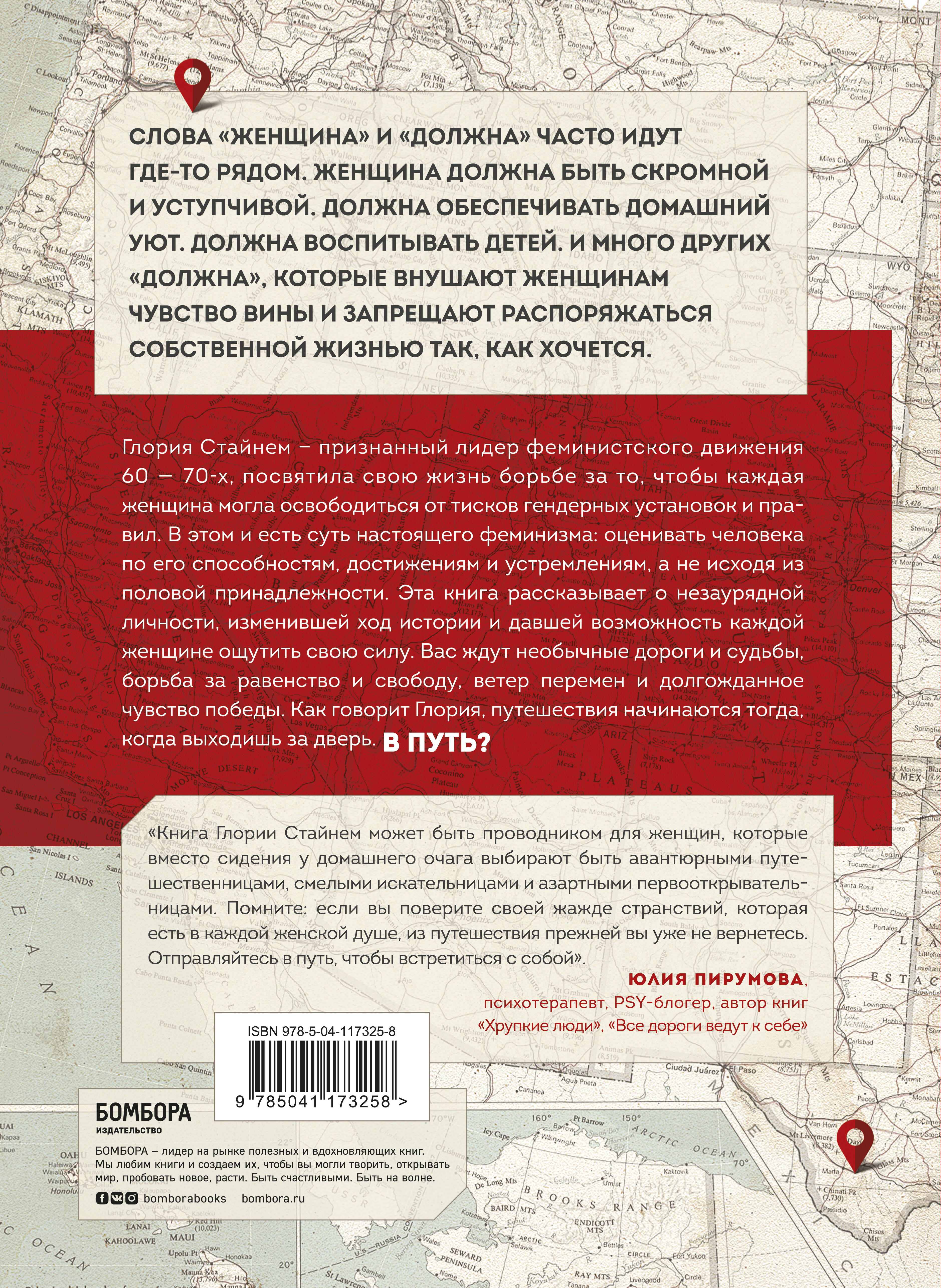 В своей откровенной и богатой прозе Глория напоминает нам, что жизнь в открытом, наблюдательном и «путешествующем» состоянии ума может повлиять на то, как мы учимся, что мы делаем и как мы понимаем друг друга. Эта книга - трогательная, забавная и глубокая история роста Глории, а также роста революционного движения за равенство. От ее первого опыта общественной активности среди женщин в Индии до работы журналистом в 1960-х годах; от вихря политических кампаний до основания журнала; от исторической Национальной конференции женщин 1977 года до ее путешествий по стране Индии. Жизнь, проведенная в дороге, позволила Глории выслушать людей и установить с ними глубокую связь, а также стать частью движения, которое изменит мир. ОБ АВТОРЕ Глория Стайнем - писательница, лектор, политическая активистка и организатор феминистского движения. Основательница журналов «New York» и «Ms.». Автор книг «Moving Beyond Words», «Revolution from Within» и «Outrageous Acts and Everyday Rebellions», вышедших в США, а также опубликованной в Индии «As If Women Matter». Кроме того, ее работы вошли во многие сборники и учебники. Она - одна из основательниц Национального политического объединения женщин, Фонда для женщин редакции журнала «Ms.», а также американского Женского медиа-центра. В других странах она участвовала в организации движений «Equality Now», «Donor Direct Action» и «Direct Impact Africa». Удостоена многочисленных почетных степеней, в том числе докторской степени в области правосудия от Колледжа Симмонза, премии Билля о правах от Американского союза защиты гражданских свобод Южной Калифорнии, Национальной премии за защиту прав сексуальных меньшинств и медали Церера от ООН. В 2012 году президент Барак Обама вручил ей Президентскую медаль за свободу, величайшую награду для гражданских лиц. В настоящий момент на базе Университета Рутгерса создана кафедра СМИ, культуры и феминологии под ее руководством. Глория живет в Нью-Йорке и постоянно путешествует по Америке и другим странам. ЦИТАТЫ: • «Кратчайший путь к переменам в обществе заключается в том, чтобы дать возможность самым слабым говорить столько, сколько их будут слушать, а самым сильным - слушать столько, сколько будут говорить». • «Быть может, истинная революция произойдет тогда, когда женщина сможет отправиться в путешествие по собственной воле и желанию, а вернувшись домой, найдет там теплый прием». • «Если вас тянет куда-то, даже против всякой логики, - идите. Значит, Вселенная пытается что-то вам сказать». • «Самый надежный показатель уровня насилия в стране - или ее способности применить насилие по отношению к другим странам - это не бедность, не природные богатства, не религия и даже не уровень демократии; это уровень насилия по отношению к женщинам. Именно он является мерилом всех прочих видов насилия». • «Когда людей разделяют на категории и классы, вместо того чтобы объединять, - проигрывают все».