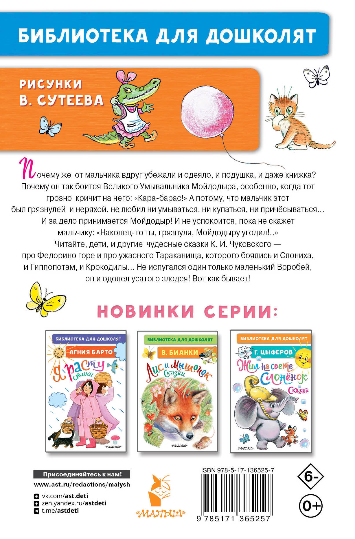 В книгу К. Чуковского "Мойдодыр. Сказки" серии "Библиотека для дошколят" вошли три сказки в стихах: "Мойдодыр", "Федорино горе" и "Тараканище". Вот уже сто лет читают дети сказки дедушки Корнея. И в каждом доме, где живёт ребёнок, живут и книги Корнея Ивановича Чуковского. Иллюстрации в книге известного детского художника В. Сутеева. Для дошкольного возраста.