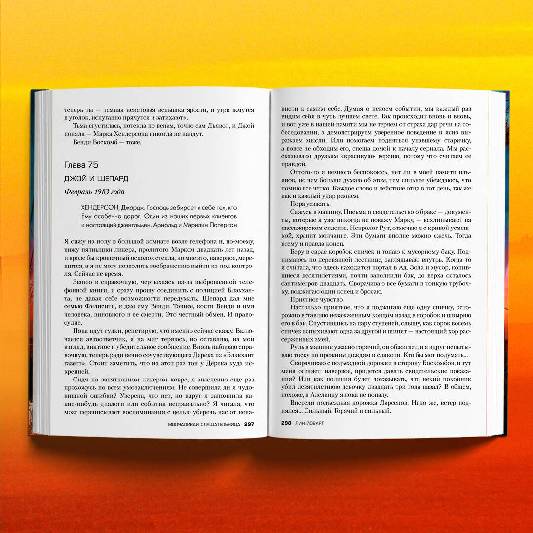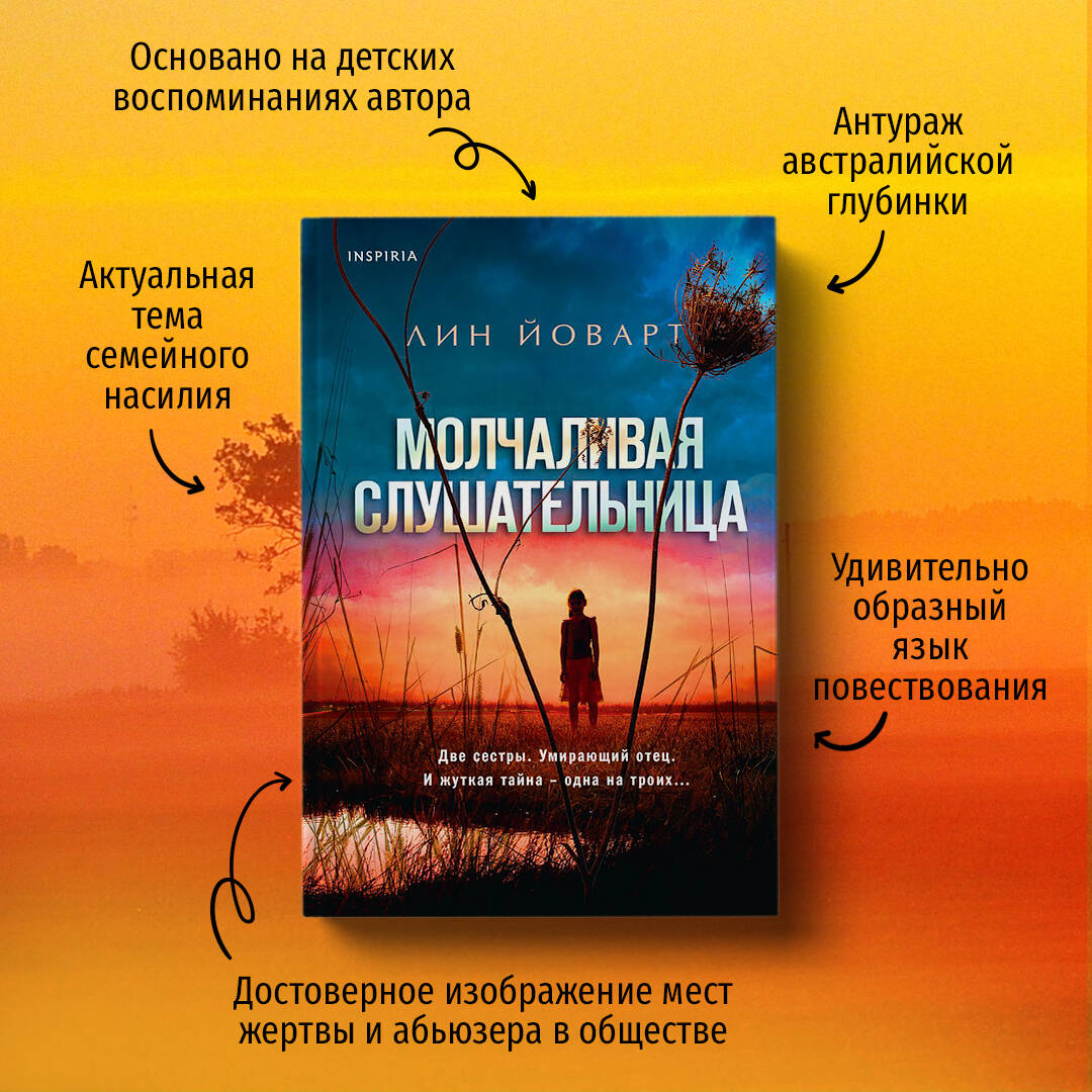 АВСТРАЛИЙСКАЯ «ТАМ ГДЕ РАКИ ПОЮТ». ОСНОВАНО НА РЕАЛЬНЫХ СОБЫТИЯХ. Две сестры. Умирающий отец. И жуткая тайна - одна на троих… Холодное сырое лето 1960 года. Глубинка австралийского континента. Одиннадцатилетняя Джой Хендерсон живет в постоянном страхе перед отцом. Старается всячески угодить ему, чтобы избежать очередного града истязаний. Но отец всегда непреклонен: его дочь - мерзкая грешница, обреченная на Ад… Много лет спустя тридцатипятилетняя Джой возвращается в родительский дом, чтобы ухаживать за тяжело больным мучителем. И, к собственному удивлению, встречает там свою «идеальную» сестру Рут. Рут нашептывает ей на ухо ядовитые слова, призывая отомстить. А на следующий день Джой обнаруживает отца мертвым, с затянутым на шее ремнем. Тем самым ремнем, которым тот когда-то порол своих детей… Этот необычайно мощный и проникновенный роман переносит читателя между 1940-ми, 1960-ми и 1980-ми годами. Незабываемое литературное полотно, изображающее мрачную австралийскую глубинку, ее подчас жестоких обитателей - и тихие омуты человеческого сознания… __________________________________________________________________ «Мрачная готическая атмосфера, целый сонм скелетов в шкафу (ну, а кому вообще живется легко?), лаконичная детективная история и герои, вызывающие сопереживание, - что еще нужно для отличного психологического триллера? Ах да, еще нужна неожиданная развязка. И она здесь есть - мастерски исполненная». - Сергей Вересков, книжный обозреватель и писатель «Драма с ярко выделенной детективной линией, вроде бы понятная читателю с начала (действие начинается, когда "как будто бы" все уже случилось), но на самом деле все только начинается! И все больше и больше появляющиеся подсказки только распаляют не только любопытство, но даже волнение - дойти до конца и узнать! Детективная драма Лин Йоварт захватывает не только напряжённостью и сложностью сюжета, но и тем, какие социальные проблемы тут освещаются. А уж рассказанные и показанные с позиции ребёнка... ЧИТАТЬ!» - Элис @bookinessa «"Молчаливая слушательница" - одна из самых сильных и лучших дебютных работ, которые мне приходилось оценивать. Книга читается на одном дыхании и впечатляет не только сюжетом, наполненным загадками и интригами, но и потрясающей атмосферой австралийской глубинки, где события окутаны флером таинственности и эмоциональное напряжение нарастает с каждой главой, приковывая внимание читателей на истории семьи Хендерсон, в которой секреты, насилие и ложь являются центральной частью их жизни. Пронзительный психологический триллер, мимо которого нельзя проходить». - Гарри @ultraviolence_g «Глубокая психологическая драма о семейном насилии. Будьте готовы окунуться в атмосферу страха и безысходности, ведь иногда за маской добродетели скрывается безумие, которое неизбежно ведёт к катастрофе». - Ольга @olga.berger_ «Душераздирающая история, которая перенесет вас в удушливые фермерские угодья Австралии и не отпустит, пока вы не откроете все тайны, сокрытые семейством Хендерсонов. Жестокая и печальная история, пробирающая до костей. Австралийское захолустье, скелеты в семейных шкафах, ненадежный рассказчик и целых два загадочных преступления… Сложите все вместе - и получите идеальный психологический триллер». - Марина Клейн, эксперт книжного рекомендательного сервиса LiveLib