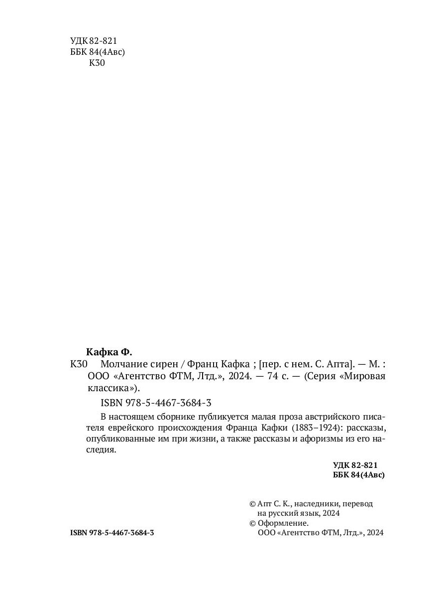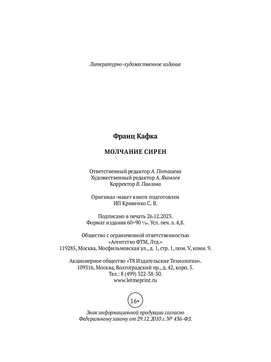 В настоящем сборнике публикуется малая проза австрийского писателя еврейского происхождения Франца Кафки (1883-1924): рассказы, опубликованные им при жизни, а также рассказы и афоризмы из его наследия.| Издательство | Т8 RUGRAM |