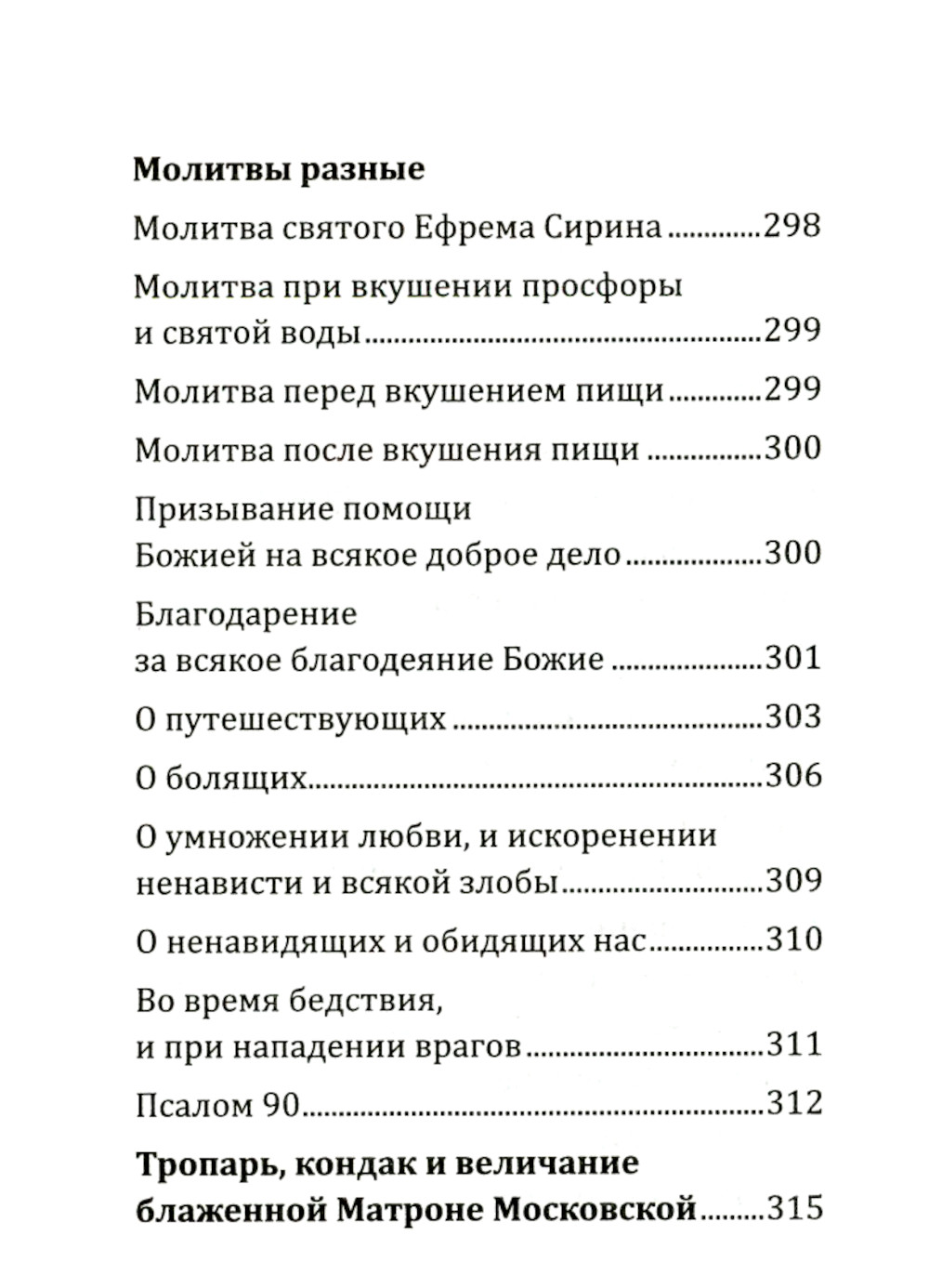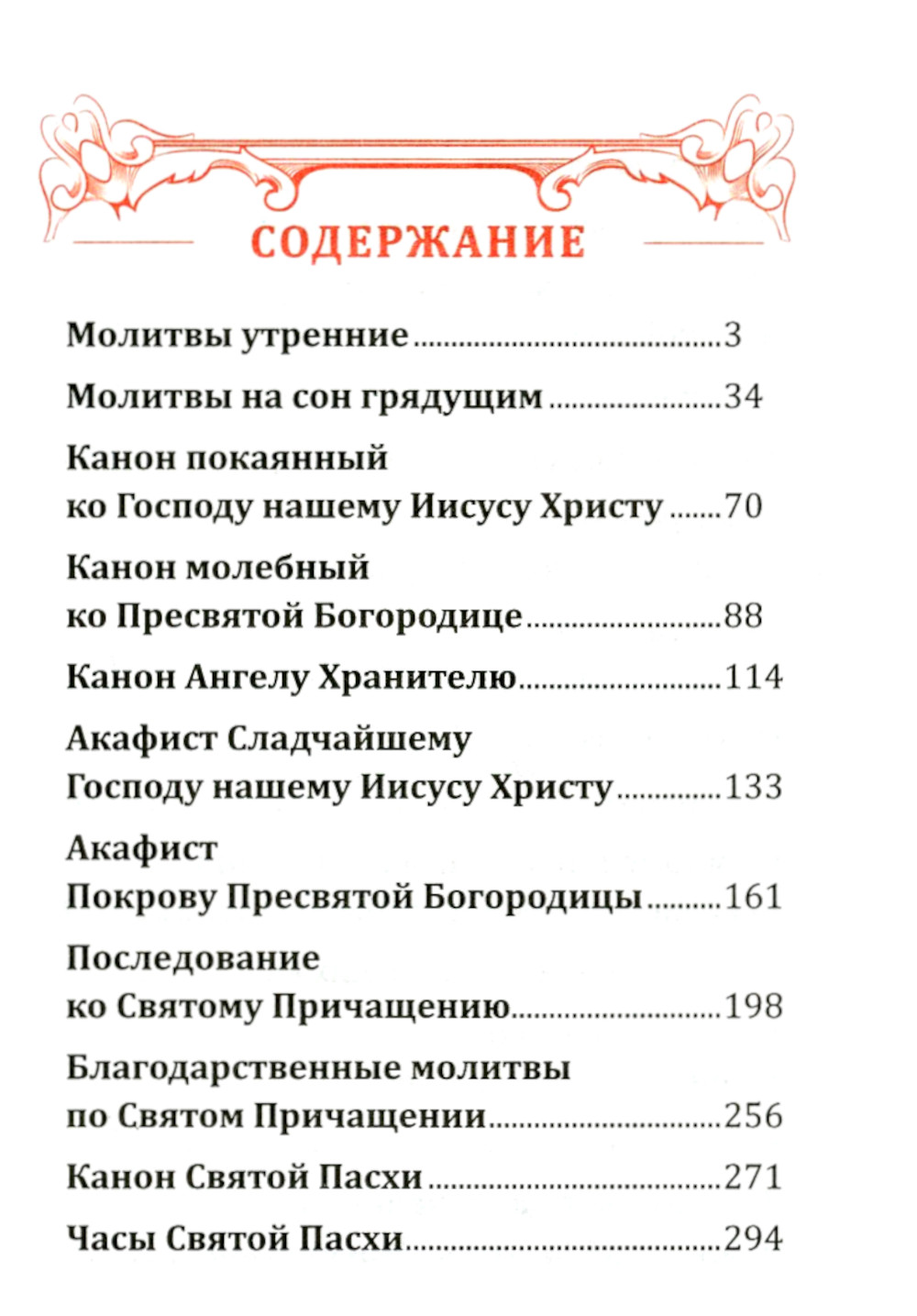 Книга содержит: Молитвы утренние; Молитвы на сон грядущим; Три канона: покаянный ко Господу нашему Иисусу Христу, ко Пресвятой Богородице и Ангелу Хранителю; Акафисты: Сладчайшему Господу нашему Иисусу Христу, Покрову Пресвятой Богородице; Последование ко Святому Причащению; Благодарственные молитвы по Святом Причащении; Канон Святой Пасхи; Часы Святой Пасхи; Молитвы разные; Тропарь, кондак и величание блаженной Матроне Московской.| Издательство | Надежда |