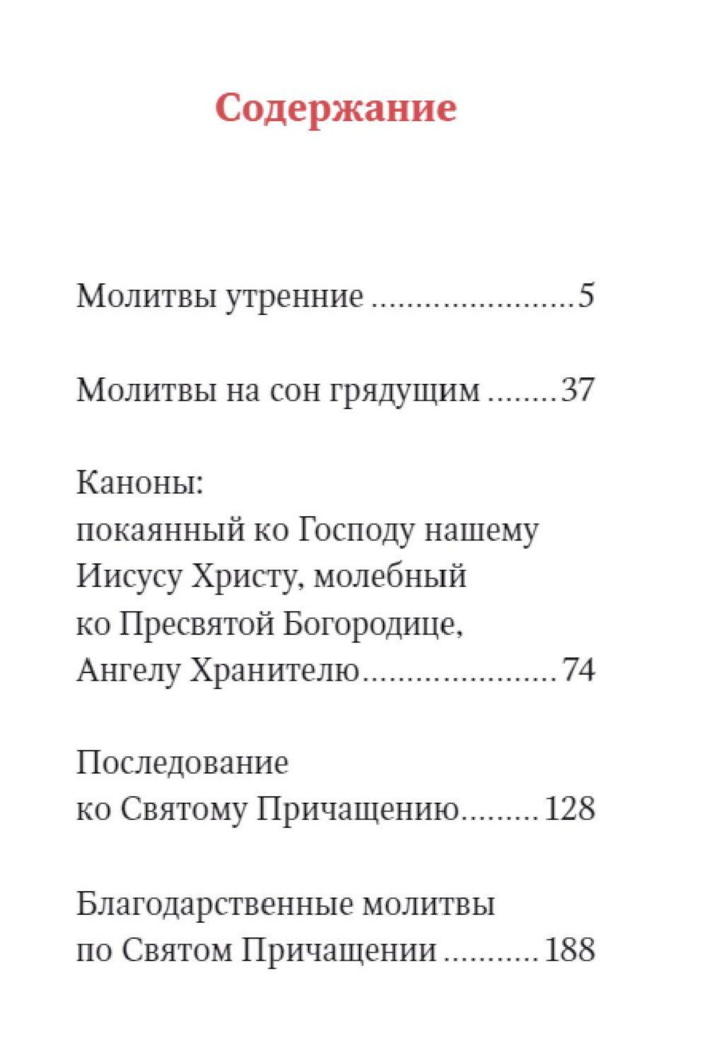 Молитвослов включает традиционный набор последований, молитвы на разные случаи жизни, а также правило преподобного Амвросия Оптинского, читаемое в искушениях и скорбях.