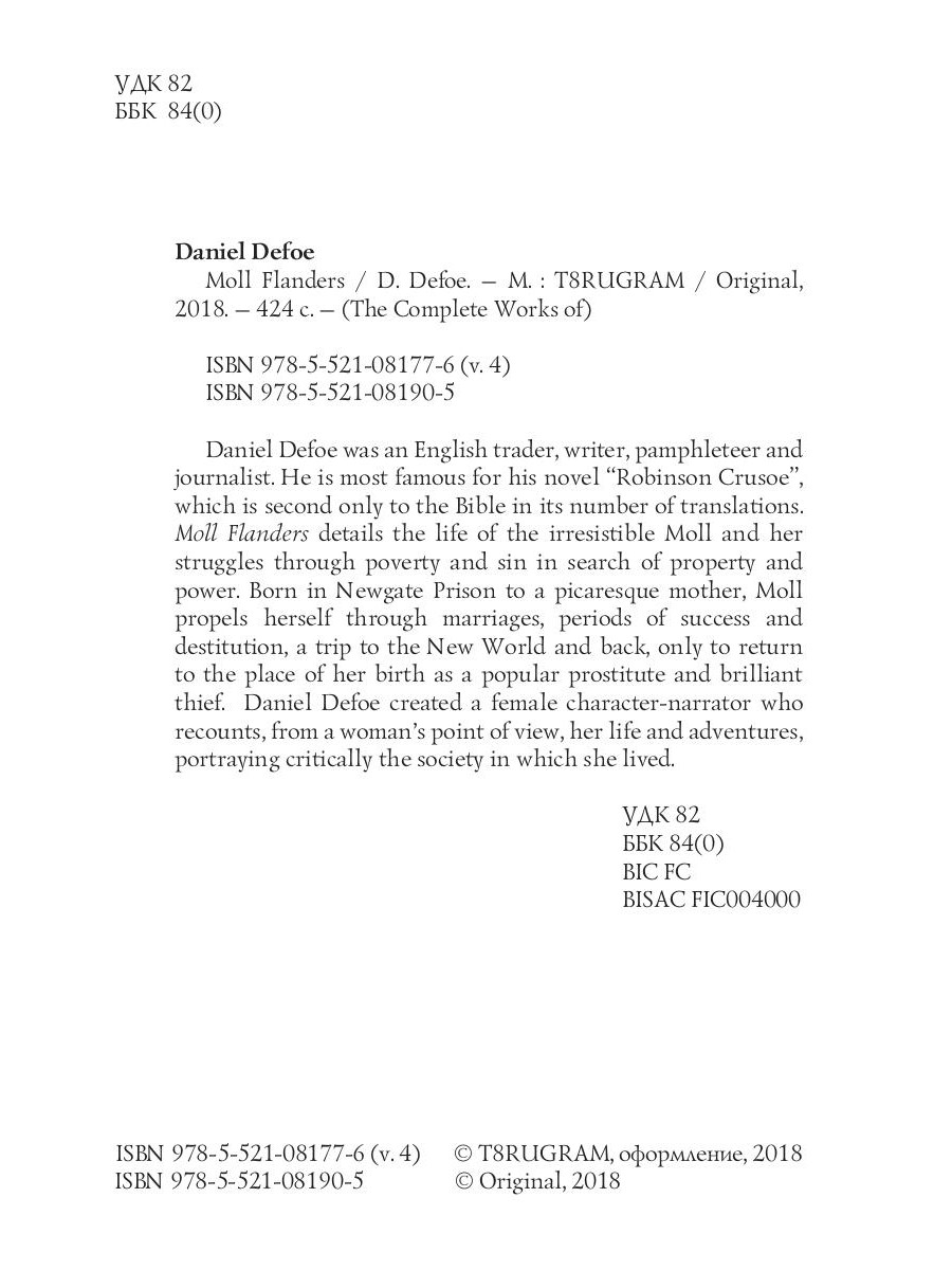 Daniel Defoe was an English trader, writer, pamphleteer and journalist. He is most famous for his novel "Robinson Crusoe", which is second only to the Bible in its number of translations. Moll Flanders details the life of the irresistible Moll and her struggles through poverty and sin in search of property and power. Born in Newgate Prison to a picaresque mother, Moll propels herself through marriages, periods of success and destitution, a trip to the New World and back, only to return to the place of her birth as a popular prostitute and brilliant thief. Daniel Defoe created a female character-narrator who recounts, from a woman's point of view, her life and adventures, portraying critically the society in which she lived.| Издательство | Т8 RUGRAM |