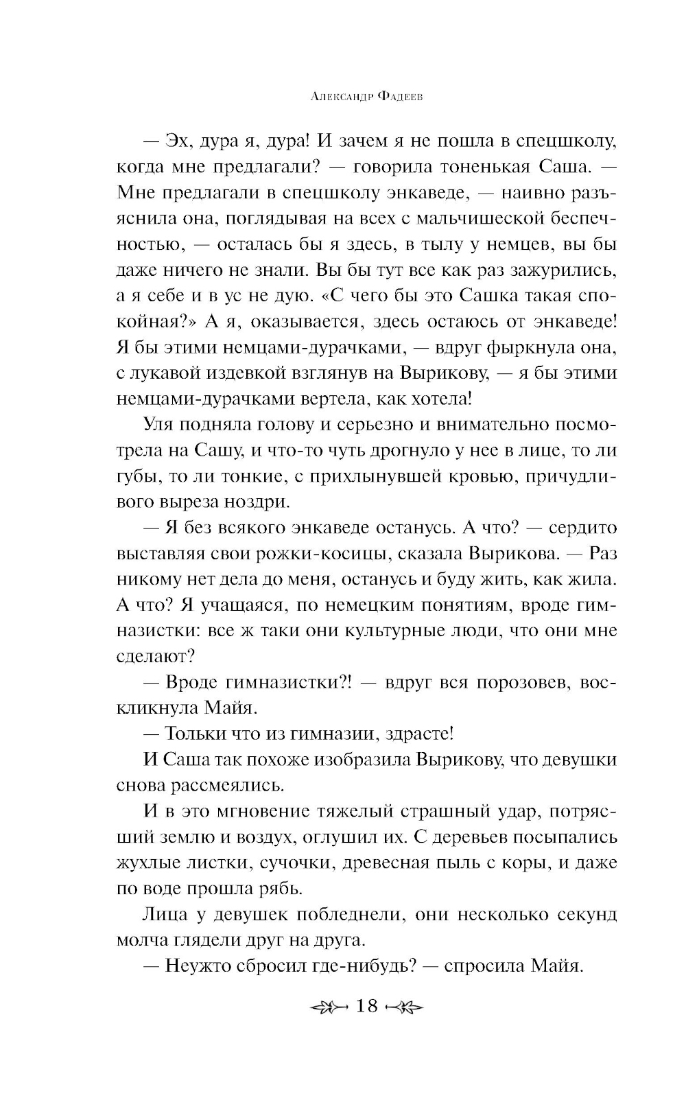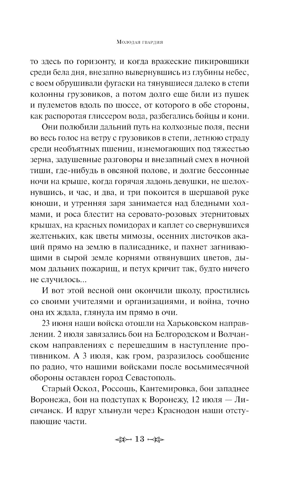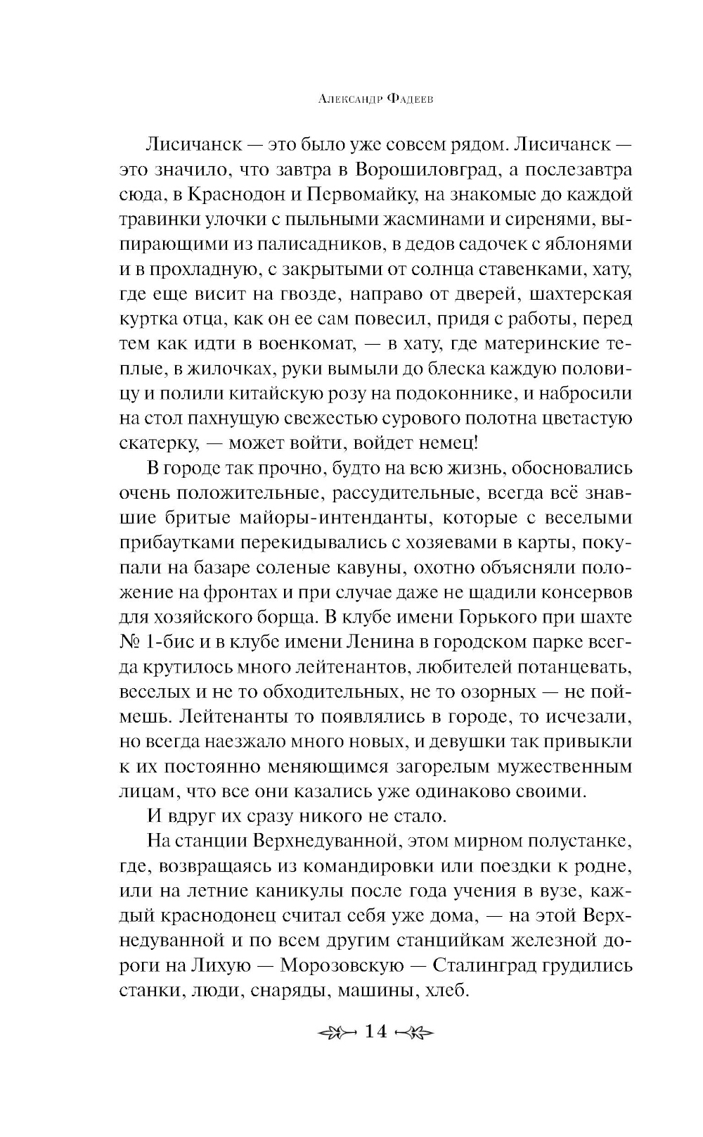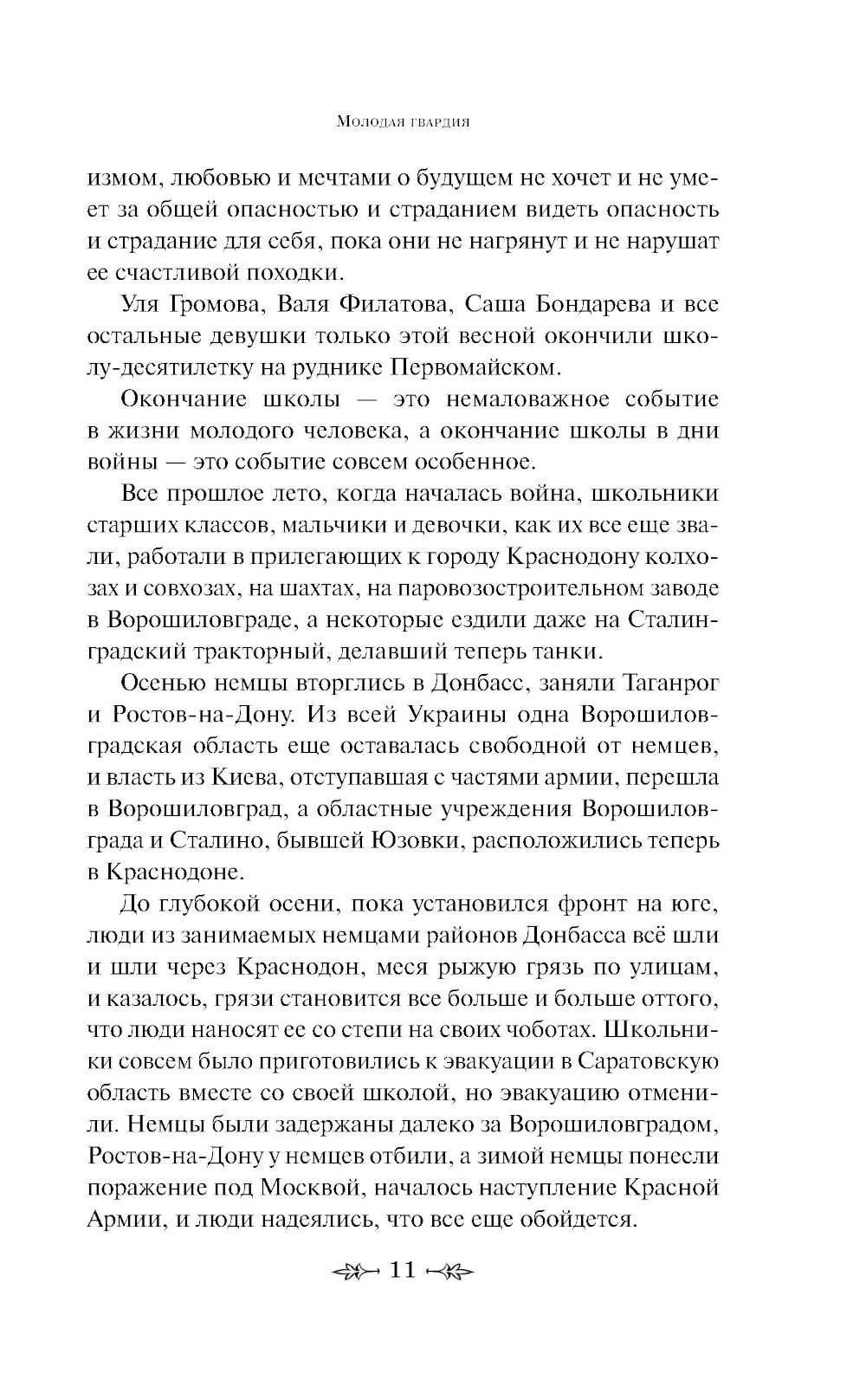 История подвига, совершенного в годы Великой Отечественной войны членами молодёжной подпольной организации города Краснодона. Не успевшие эвакуироваться из города молодые ребята решают вести непримиримую борьбу с немецкими захватчиками и организуют подпольную группу «Молодая гвардия». Им удается скрытно вести свою деятельность, пока не происходит досадный прокол, который приводит к трагическому финалу. Александр Фадеев был глубоко потрясен реальной историей, которую взял за основу этого романа, о храбрости и стойкости, долге и ужасающих последствиях предательства. Комсомольцы - участники подполья были зверски замучены гитлеровцами и сброшены в шахты, откуда их останки были извлечены советскими воинами и захоронены в марте 1943 г.| Издательство | Эксмо |
