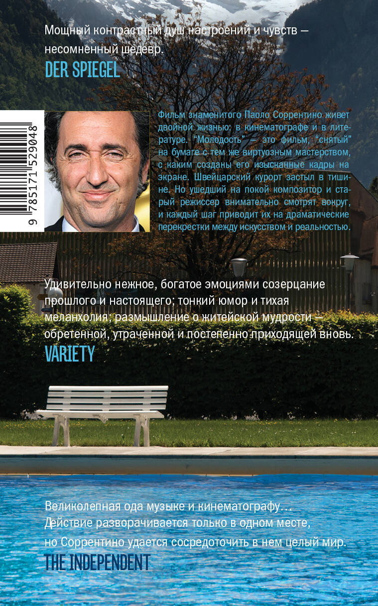"Молодость" Паоло Соррентино - это и книга, и фильм, который был снят по ней и показан на Каннском фестивале 2015 года. Текст представляет собой быстрый, точный слепок того, что должно происходить на экране. Он полон коротких, общих описаний, которые ничего конкретно не сообщают о деталях, но задают общее настроение расслабленности, свежести и отдыха. Место действия - элитный швейцарский курорт в альпах, где проводят время два друга в летах: Фред Баллинджер и Мик Бойл. Оба - полностью реализовавшие себя в творчестве люди, один - всемирно известный композитор и дирижер, другой - успешный режиссер, занятый съемкой своей последней и, как он надеется, лучшей картины. Отжив свое, Фред и Мик занимают позицию созерцателей, наблюдая за обитателями курорта. Но через какое-то время эти монотонные прогулки, купание и приемы пищи отъезжают в сторону, как декорации, открывая нам внутреннюю жизнь этих людей. Между ширмами начинают проглядывать тихие и яростные трагедии постояльцев. Где-то зарождается любовь, где-то происходит расставание. И тем удивительнее на этом фоне раскрываются сердца стариков, готовых жить и творить, стоящих перед лицом смерти и забвения и не способных в них поверить.